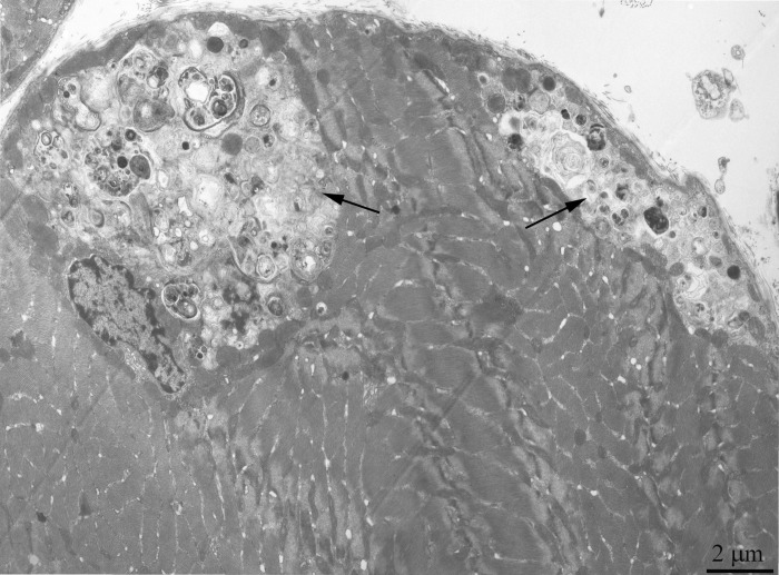 Alterations in the ultrastructure of the skeletal muscle chondriome of the OXYS rats become ever strongly pronounced by the age of 24 months. Fig. 9 clearly demonstrates a dramatic degradation of the system of branched interfibrillar mitochondria. In the isotropic region, there are only small solitary mitochondria. In muscle fibers of this group of animals, we have also found another type of destructive changes in the ultrastructure of subsarcolemmal mitochondria and the whole muscle fibers. In Fig. 10, one can see extensive area occupied with autophagosomes (the arrows).