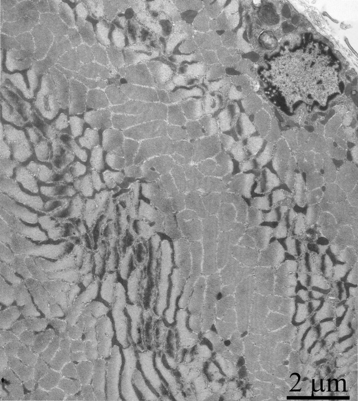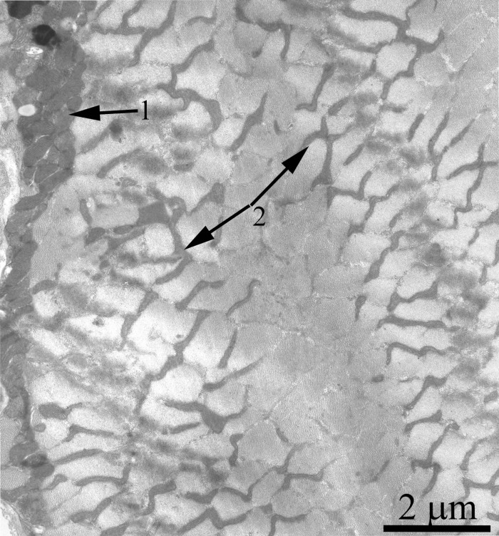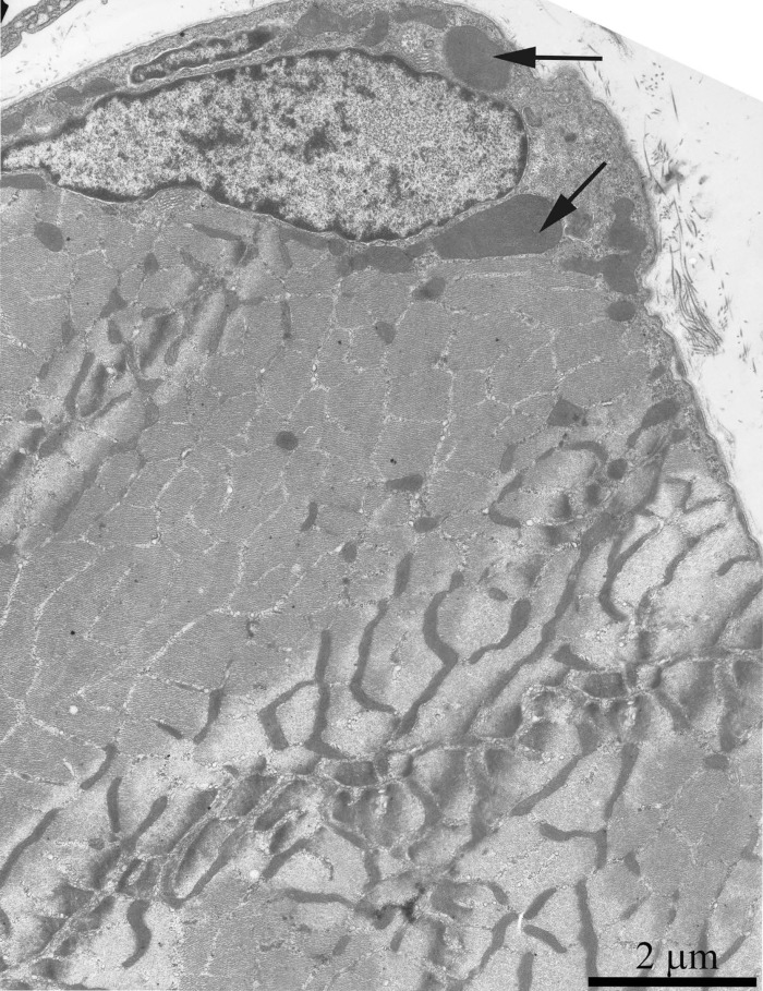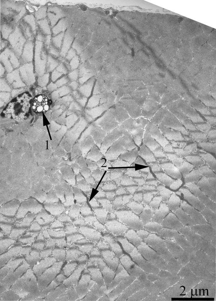 Fig. 4 shows a general view of a skeletal muscle fiber of the SkQ1-treated Wistar rats at the age of 24 months. The mitochondrial apparatus of these animals looks well developed. One can see a large subsarcolemmal mitochondrial cluster (Fig. 4, the arrow 1) and a numerous branched interfibrillar mitochondrial profiles (Fig. 4, the arrow 2). The mitochondrial ultrastructure proved to be intermediate between those of young and old SkQ1-untreated animals (Fig. 2C).