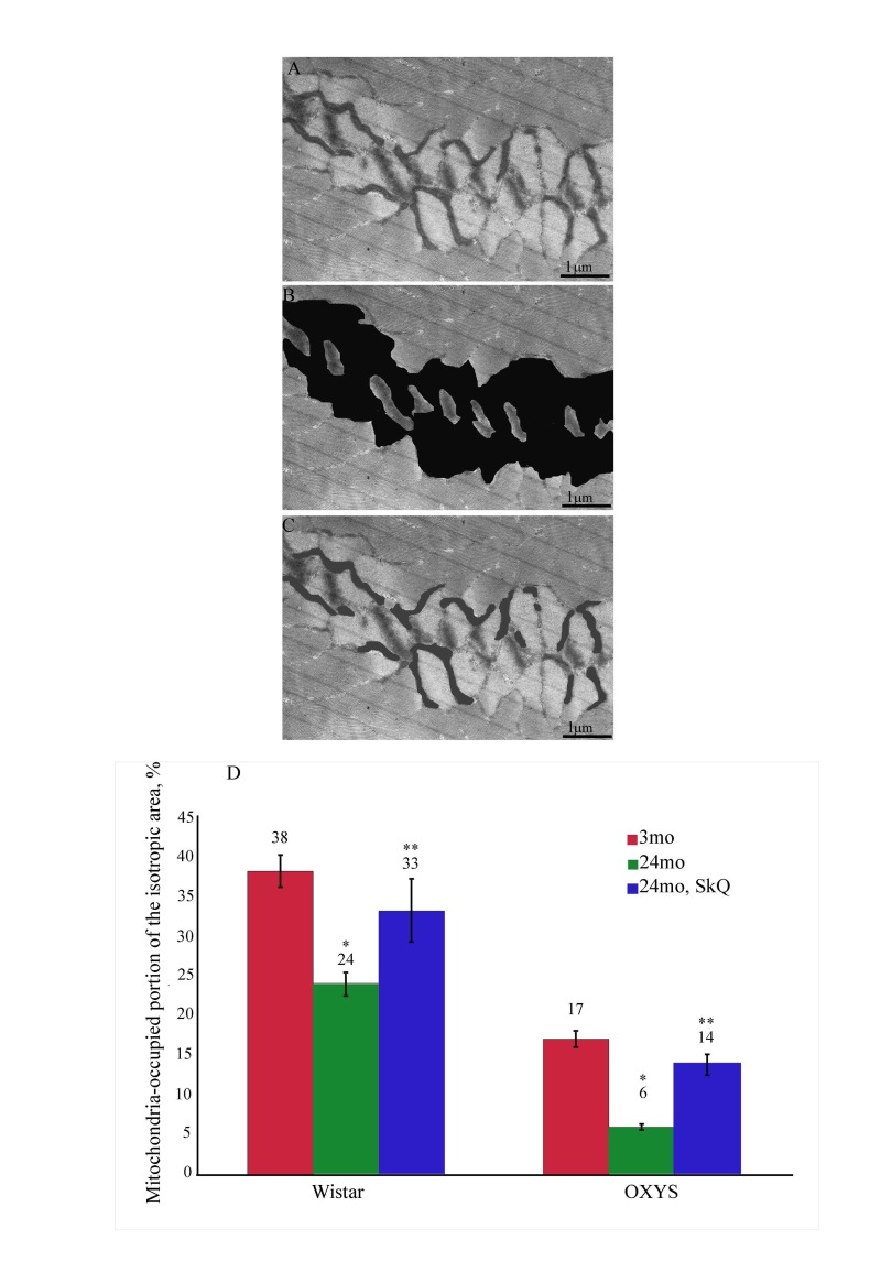 The treatment of animals with a mitochondria-targeted antioxidant SkQ1 retarded development of age-related destructive pathological changes in mitochondria of both Wistar and OXYS rats. Again, this is true for the amount of mitochondria, the development of mitochondrial reticulum and ultrastructure of the mitochondrial cristae.