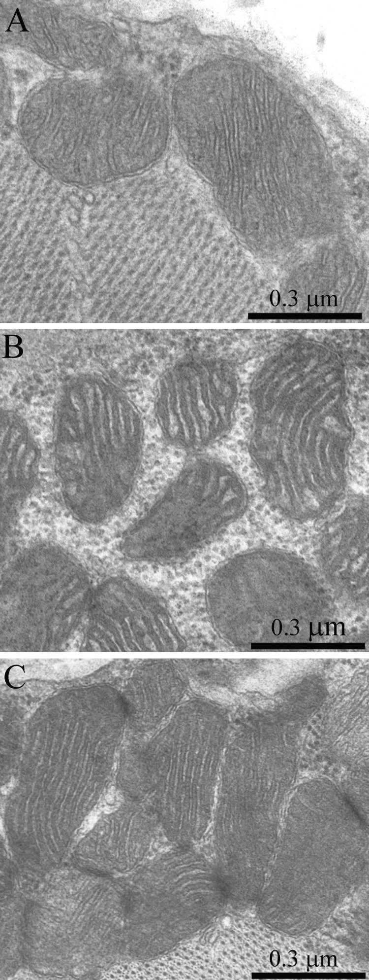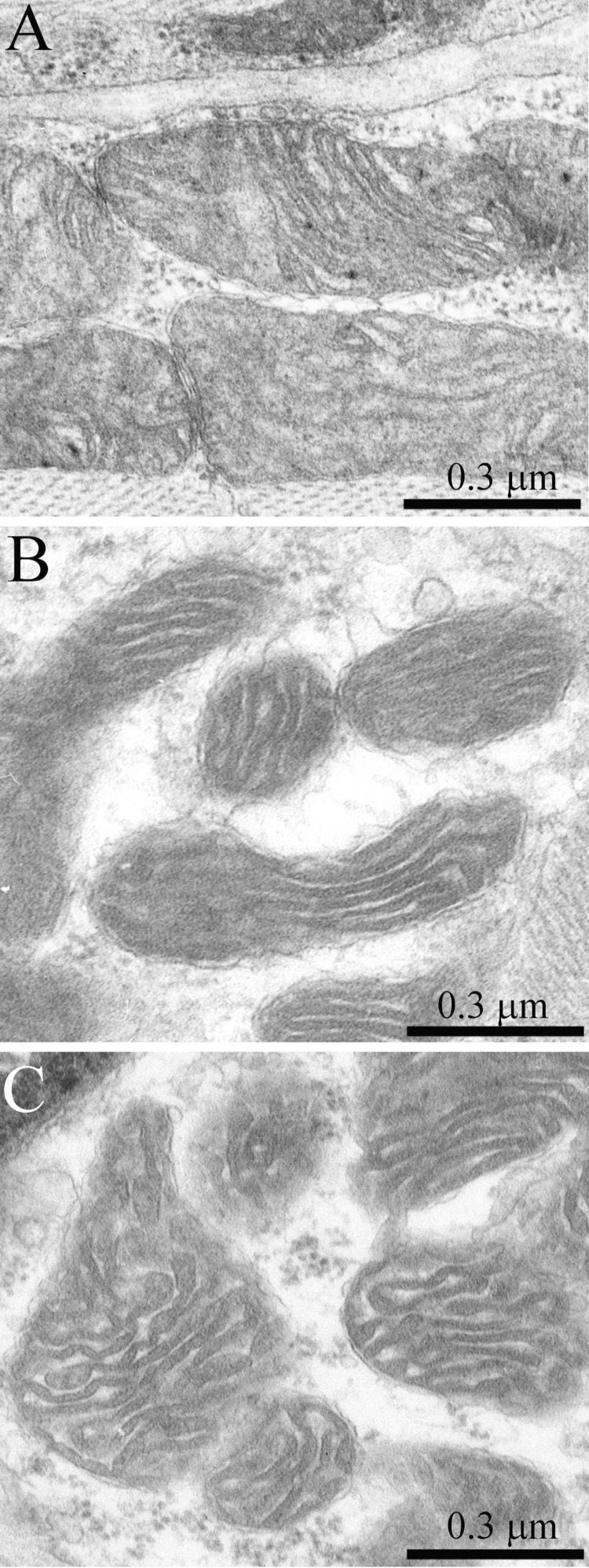 In addition to the above-described alterations in the general structure of the mitochondrial apparatus of muscle fibers, the 24-month-old OXYS rats showed significant changes in the ultrastructure of mitochondria. It consisted in a compressed electron-dense matrix with separate regions of tightly located membranes of the adjoining cristae as well as in an increased volume of the intermembrane space (Fig. 8B) that corresponds to the de-energized state.