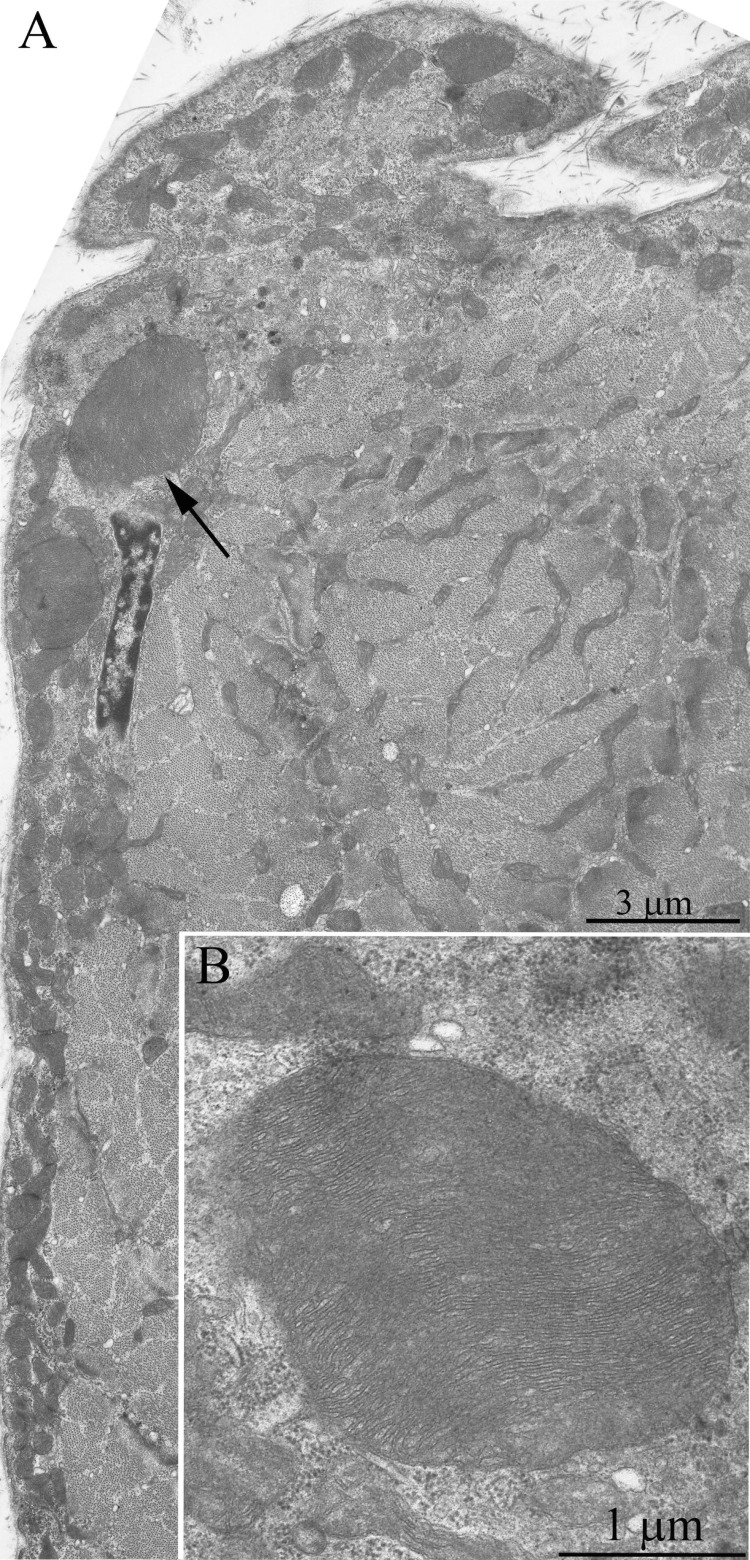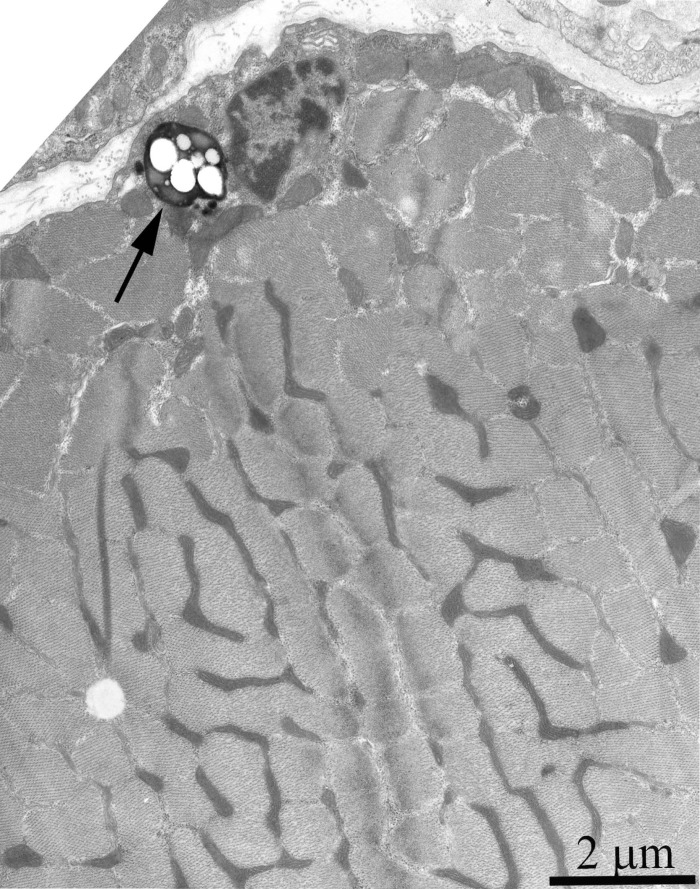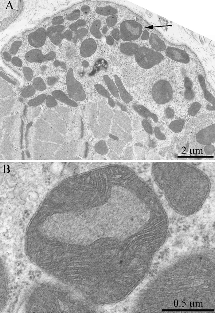 Ultrastructure of the mitochondrial apparatus of skeletal muscle of the Wistar rats at the age of 24 months proved to be different from that of young animals. First of all, in clusters of subsarcolemmal mitochondria, one could see autophagosomes surrounded by mitochondria (see, e.g., Fig. 3, the arrow). As to the isotropic region, only slightly branched mitochondria were revealed instead of the network of elongated mitochondria. Mitochondrial ultrastructure was also significantly changed (Fig. 2B): the electron density of the matrix is increased alongside with a decrease in its volume, the intermembrane (intracristal) space being increased. According to the David Green's classification [30], such changes in the mitochondria ultrastructure correspond to the de-energized state of mitochondria.
