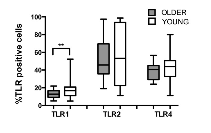 Human PMN express most TLRs (except TLR3) and respond to TLR ligand stimulation with production of pro-inflammatory cytokines and release of O2-, reflecting their active functions in the innate immune response [22]. We compared TLR expression between young and older adults and observed reduced expression of TLR1 by PMN of the older as compared to young adults (Fig. 1; p=0.02), which is consistent with previously described lower expression of TLR1 on monocytes and dendritic cells of older adults [15, 18]. Expression of TLR2 and TLR4 were equivalent in both age groups, as reported previously [23]. While TLR1 surface expression was reduced in PMN from older donors, no significant age-related differences were detected for mean fluorescent intensity of TLRs (data not shown), suggesting that the reduction in TLR1 surface expression may reflect age-related effects on intracellular trafficking pathways of TLR1, including changes in plasma membrane viscosity [24] or in PMN lipid raft domains in older individuals [25].