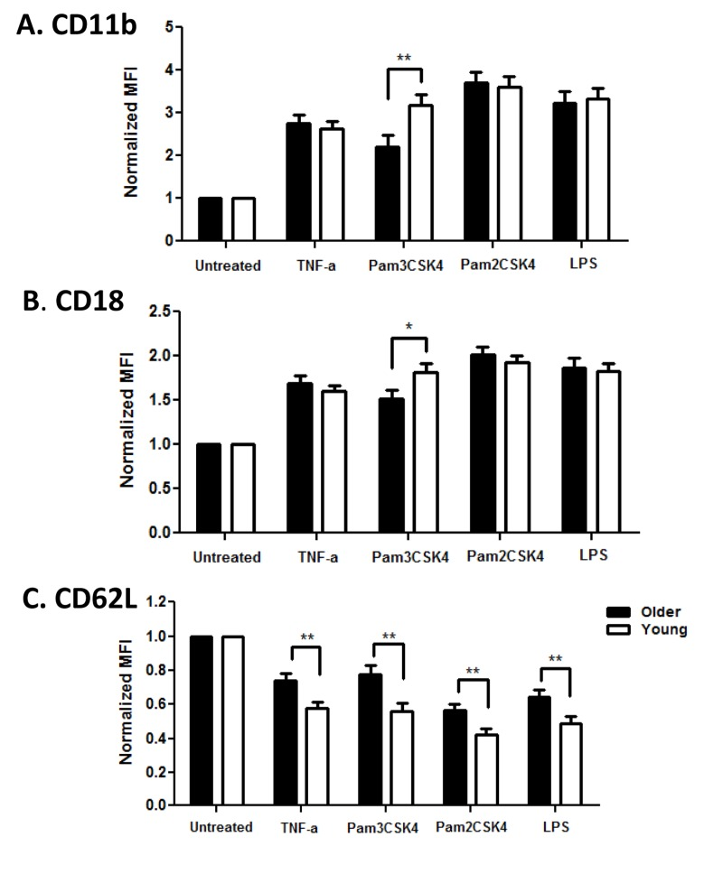 Activation of PMN leads to dramatic changes in adhesion to endothelial surfaces to promote diapedesis and PMN exit to the site of injury or infection, mediated in part by upregulation of integrins CD11b and CD18 and shedding of L-selectin (CD62L) from the cell surface [26]. We quantified expression of these adhesion markers to detect age-related differences in PMN functional efficiency. Baseline levels of CD11b and CD18 were not different between age groups, while CD62L was somewhat lower in the older cohort (data not shown). After stimulation with TLR ligands, PMN of both age groups upregulated CD11b and CD18, but the increase was significantly lower in PMN from older adults after stimulation through TLR1 (Pam3CSK4; Fig. 2A CD11b, p<0.01; Fig. 2B CD18, p<0.05). Notably, loss of CD62L expression after activation was also reduced on PMN from older adults, but this reduction was not limited to TLR1 stimulation (Fig 2C, p<0.01).