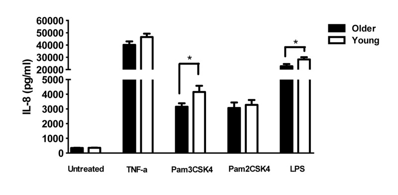 To determine the consequences of the lower levels of TLR1 on PMN in older adults, we quantified the production of cytokines from PMN of younger and older adults after stimulation by TLR ligands. PMN stimulated with ligands for TLR1 (Pam3CSK4) produced significantly higher IL-8 compared to PMN in medium alone, as expected [22],but levels from elderly adults were significantly lower than those from younger adults (Fig 3; p <0.05). Lower TLR1-induced cytokine production would be expected as a consequence of age-related reduced TLR1 expression. In contrast, stimulation with Pam2CSK4, the ligand for TLR2, elicited equivalent levels of IL-8 from PMN of both age groups (Fig. 3), likely reflecting the equivalent levels of TLR2 across age groups. Of note, production of IL-8 by PMN from older adults was also reduced after stimulation with LPS, the ligand for TLR4 (Fig. 3).