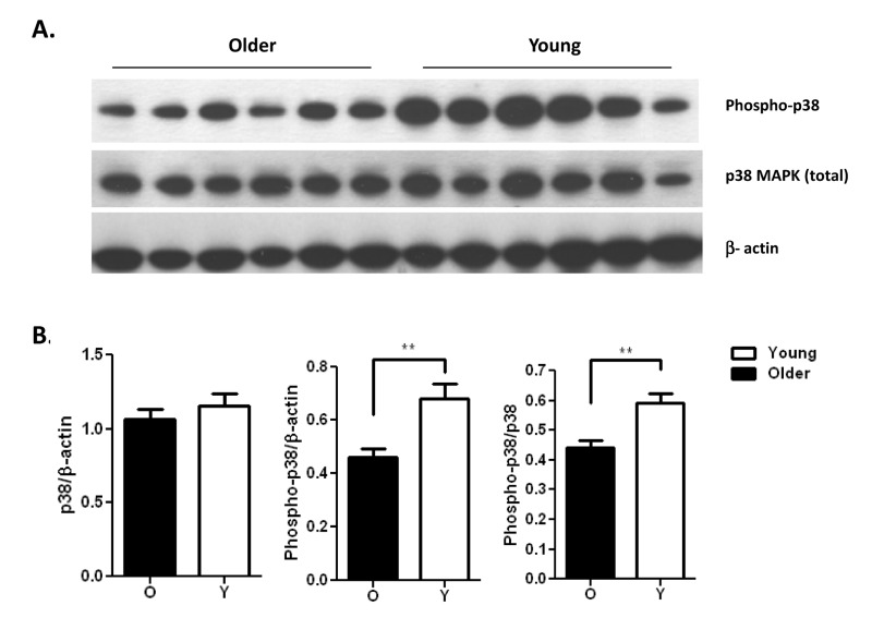 Reduced activation and production of cytokines by PMN in elderly adults may be significant for multiple PMN functions in vivo that depend on adhesion for recruitment and cytokines for activation of interacting immune cells [8]. To dissect the mechanism(s) underlying this reduction, we examined key components of the signaling cascade of PMN activation to assess age-related changes in signaling pathways. Signaling intermediates in activation of PMN include MAP kinase and NF-κB pathways [27, 28] and we have previously shown an age-dependent reduction in p38 MAPK pathway in TLR5 mediated production of IL-8 by monocytes [17]. Thus we assessed activation of p38 MAPK, signaling intermediate in PMN, and quantified PMN of both age groups for the level of phosphorylation of p38 MAP kinase after 15 min stimulation with the TLR1 ligand Pam3CSK4. While the total levels of p38 MAP kinase were not significantly different between age groups (Fig. 4A, middle row; ns), after stimulation the level of active phosphorylated p38 was significantly elevated in PMN of younger adults (Fig. 4A, top row). Quantitation of densitometry of blots from 21 pairs of younger and older subjects comparing the relative level of phosphorylated to total p38 shows significantly more activation for PMN of younger adults (Fig. 4B; p<0.01).