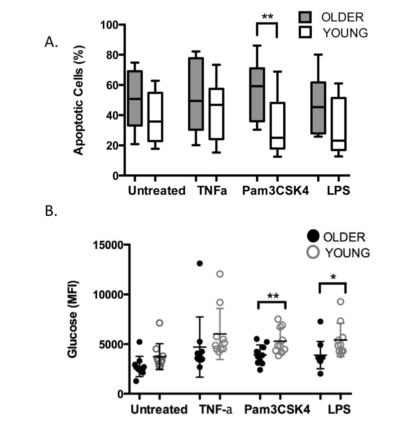 Although short-lived, PMN are tremendously active cells, and with few mitochondria, they rely primarily on glycogen stores to support their activity [31]. At an inflammatory site, PMN have been shown to dramatically increase their content of glycogen by up to ten fold, presumably to support the high metabolic requirements of their immune-mediated program [31]. When we measured glucose accumulation in PMN using 2-NBDG, a fluorescent glucose marker, we noted somewhat lower levels of glucose in PMN of older adults at baseline that did not reach statistical significance (Fig 5B, ns). In response to stimulation, as expected, higher levels of glucose were detected in PMN of both age groups and accumulation of fluorescent glucose was higher across all stimulants as compared to untreated PMN (Fig. 5B, p<0.001). Notably, significantly lower levels of glucose accrued in PMN of older adults, particularly when stimulated through the TLR1 pathway (Fig. 5B, p< 0.02), and somewhat less through stimulation the TLR4 pathway (Fig. 5B, p<0.04).