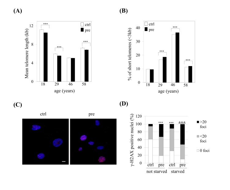 Our previous studies provided evidence that prelamin A accumulation in hMSCs leads to reduced lifespan in culture as a consequence of premature senescence of these cells [23]. To assess whether we could take advantage of this system as an experimental model of human cellular aging, we challenged prelamin A-hMSCs to recapitulate other hallmarks of aging recently proposed by Lopez-Otín and collaborators [24]. We first studied whether prelamin A accumulation can induce telomere shortening, a characteristic of normal aging cells. We analyzed telomere length in control (ctrl) or prelamin A-hMSCs (pre) from four different bone marrow donors of different ages (Fig. 1A) using a quantitative fluorescence in situ hybridization, HT-Q-FISH [25]. As shown in Figure 1A, hMSCs had an average telomere length ranging from 5.11 to 11.17 kb, in agreement with previous studies in which a mean telomere length of 7.2 kb has been described for adult hMSCs [26]. As expected, the youngest donor (18 years of age) had the longest telomeres (11.17 kb in control cells). Of note, we observed in each donor a decline in mean telomere length of prelamin A-hMSCs when compared to the controls cells, a change which was statistically significant in three samples (640 bp loss in 18 year old donor, 400 bp loss in 25 year old donor, 380 bp loss in 58 year old donor). Given that the percentage of critically short telomeres in human cell population increases significantly with age [27, 25] we explored whether prelamin A accumulation induced such increase in hMSCs in vitro. The percentage of telomeres with a length < 3kb was slightly but significantly increased (except for the 18 years old donor) in prelamin A-hMSCs (Fig. 1B).
