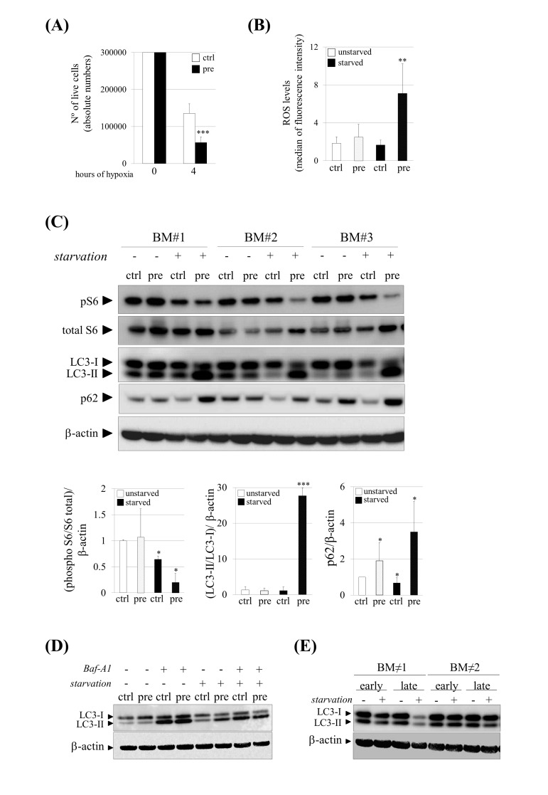 Finally, we confirmed the reduction of autophagy from a general perspective of aging such as hMSCs in replicative senescence. For that, we compared early-passage hMSCs (<5) with late-passage ones (>15) under both basal and serum starvation conditions detecting a decrease in LC3-II levels at late passages cells only after serum starvation conditions (Fig. 2E).