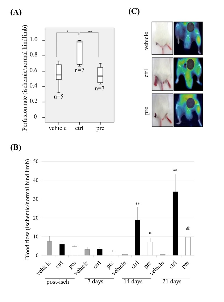 Since prelamin A-hMSCs recapitulate all the aged phenotypes tested, we decided to ascertain the relevance of these changes by challenging their functional competence in vivo. One of the established models for this purpose is based on the ability of hMSCs to significantly improve vascular circulation after their transplantation into the ischemic hind limbs of immunocompromised mice [35]. Thus, mouse limb ischemia was induced by ligation of the femoral artery and its branches in the left hind-limb of SCID mice. Then, control (ctrl) or prelamin A-hMSCs (pre) were transplanted by intramuscular injection into the left hind-limb immediately after ligation. As a control of the technique, a subset of mice was injected with culture medium alone (vehicle). 14 days after cell transplantation, the perfusion rate (tissue functionality) of the control and the ischemic limbs was assessed by Positron Emission Tomography (PET). The vehicle group (n=5) presented a mean perfusion rate of 0.5566 (standard deviation: 0.1632) and similarly, the set of mice given an injection of prelamin A-hMSCs (n=7) exhibited a mean of perfusion rate of 0.5534 (standard deviation: 0.113) (Fig. 3A). However, animals treated with control-hMSCs (n=7) significantly improved their perfusion rate (mean 0.8580; standard deviation: 0.1666) in contrast to the vehicle group (p<0.05) or prelamin A-hMSCs group (p<0.01). We also monitored the hind limb blood flow with a laser-Doppler system over time: post-ischemia and 7, 14 and 21 days after transplantation, comparing the blood flow in the ischemic hind limb versus the blood flow in the contralateral one. Laser Doppler revealed a significant restoration of blood flow after 14 days post-ischemia in limbs injected with control-hMSCs (Fig. 3B). Consistent with these results, 100% of mice injected with vehicle lost their left hind limb and 60% of animals injected with prelamin A-hMSCs did it. However, only 28% of mice injected with control-hMSCs suffered the amputation of hind limb as a consequence of the induced ischemia (Fig. 3C).