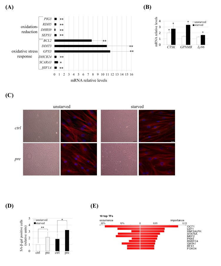 The gene expression dys-regulation was validated (Fig. 4A) by performing Q-RT-PCR analysis on a subset of dys-regulated genes included in oxidation-reduction (SEPX1, DHRS9, RDH5 and PIG3) and in oxidative stress response (HIF1A, SCARA3, DHCR24, DDIT3, BCL2 and GPX3) categories identified previously by DAVID analysis (Table 2). We also validated the expression of some genes known to be up-regulated in senescent hMSCs [38]: CTSK, GPNMB and Ly96 (Table 2 and Fig. 4B). At the same time, we detected typical morphological changes confirming the enhanced senescence of these cells: pre-hMSCs under serum starvation became larger with irregular and flat shape (Fig. 4C) and these cells exhibited increased senescence associated β-galactosidase (SA-β-gal) staining (Fig. 4D).