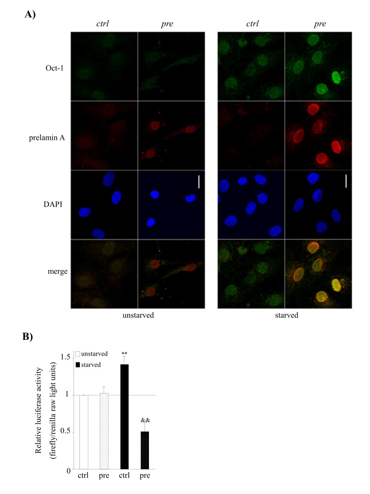 Given that Oct-1 is known to be a sensor of cellular stress [40] we assessed whether serum starvation conditions and/or prelamin A accumulation affects Oct-1 expression and subcellular distribution by confocal microscopy analysis. As expected, we detected that the expression of Oct-1 was induced and its localization was nuclear in control-hMSCs after subjecting the cells to a stress condition such as serum starvation (Fig. 5A).