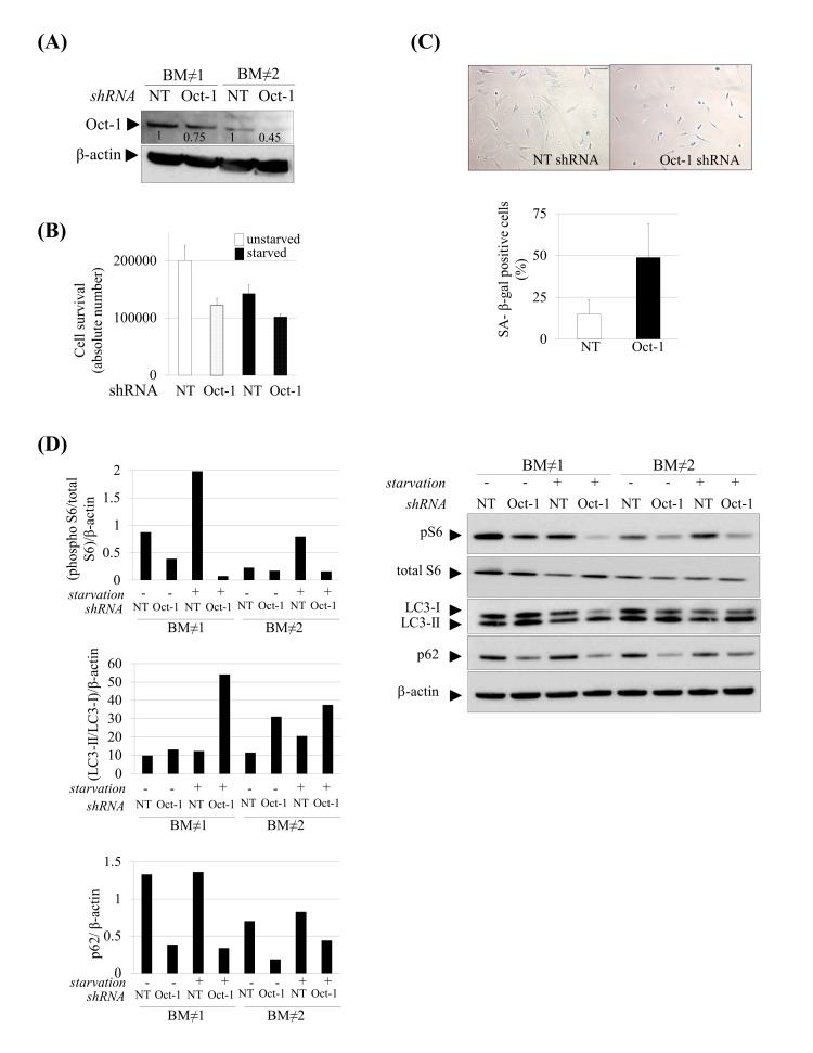 Then, we wonder whether Oct-1 could account for other hallmarks of aging focusing on two which were also altered in our experimental human model as a consequence of prelamin A accumulation: cellular senescence and autophagy. Senescent cells were analyzed by β-galactosidase staining (Fig. 6C) which showed a significant increase in senescence in hMSCs silenced for Oct-1. We next assessed the autophagy pathway in Oct-1 silenced cells (Fig 6D). Similar to prelamin A-hMSCs under serum starvation conditions (Fig 2C), there was a decrease in the expression of phospho-S6 protein in Oct-1 silenced cells especially under serum starvation conditions and an increase in the formation of autophagosomes, as denoted by the shift from LC3-I to LC3-II form. These results showed that Oct-1 functions as an essential transcription factor for the activation of the mTOR pathway and inhibition of autophagy under stress conditions. However, and contrary to our previous observations in prelamin A-hMSCs, the autophagy process in Oct-1 silenced hMSCs seemed to be efficient, as denoted by the decreased expression of p62 protein. Importantly, this result was seen independently of serum starvation conditions (Fig 6D), indicating that Oct-1 is a critical factor for regulating p62 expression in hMSCs.