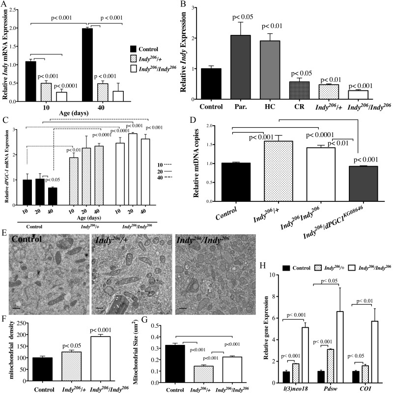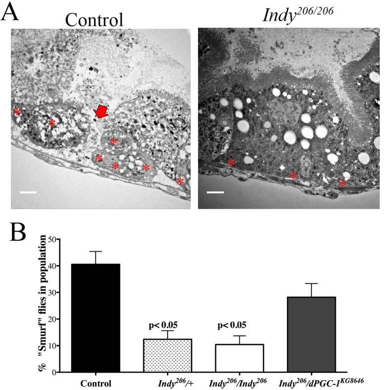 We next examined whether dPGC-1 upregulation in the midgut of Indy mutant flies was sufficient to increase mitochondrial biogenesis by measuring mitochondrial density. The ratio of mitochondrial DNA to nuclear DNA in the midgut of Indy206/+ and Indy206/Indy206 mutant flies is significantly increased compared to control at 40 days (Fig. 1D). Using double mutant flies with the Indy206 mutant allele and a hypomorphic dPGC-1 allele (Indy206/dPGC-1KG08646), we determined that the observed increase in mitochondrial DNA copy number, which depends on increased dPGC-1 levels. These flies have mitochondrial DNA copy numbers similar to those observed in control flies at 40 days (Fig. 1D). Increased mitochondrial biogenesis in enterocytes residing in the anterior midgut of Indy mutant was confirmed by electron microscopy and the point counting method. Enterocytes comprise ~90% of the midgut cell populations; therefore thery represent the majority of cell types and can be used to indicate overal mitochondrial density in the midgut. Electron micrographs of Indy206/+ and Indy206/Indy206 mutant midgut tissue show a clear increase in mitochondrial density and significantly smaller size by 20 days compared to controls (Fig. 1E-G).