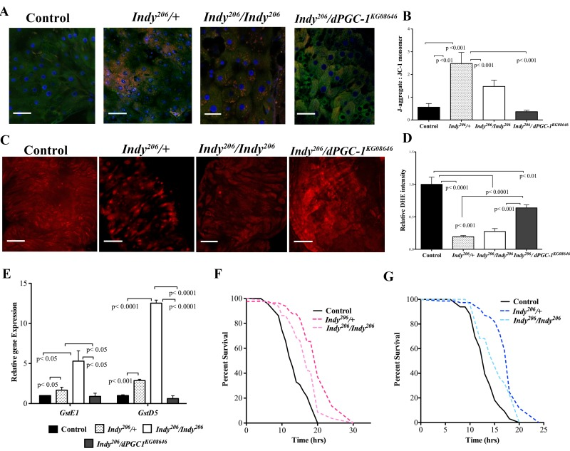 High mitochondrial membrane potential is associated with preserved mitochondrial physiology and efficiency. We determined the status of mitochondrial membrane potential in Indy206/+ and Indy206/Indy206 mutant midgut tissue by using positively charged JC-1, which fluoresces green as a monomer in cytoplasm but forms red aggregates upon entering the mitochondrial matrix as a result of high membrane potential. The red:green ratio in aged Indy mutant midguts is significantly greater in both Indy206/+ and Indy206/Indy206 mutants compared to controls (Fig 2A,B). Moreover, the ratio for Indy206/dPGC-1KG08646 double mutants is strikingly similar to that observed in controls suggesting that dPGC-1 mediates changes in mitochondrial physiology observed in Indy mutants (Fig. 2A,B).
