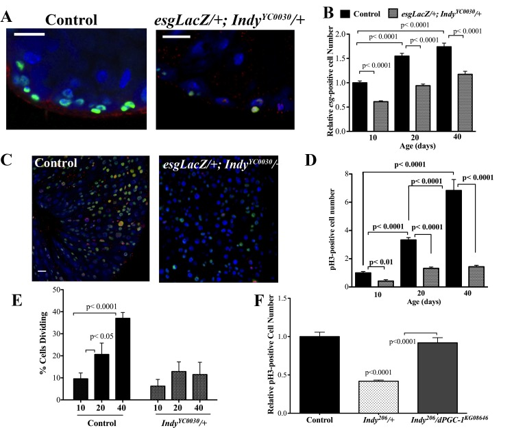 Phosphorylation of histone 3 (pH3) occurs during mitosis and marks active cell proliferation [27]. esgLacZ;IndyYC0030/+ mutant flies have significantly fewer pH3-positive cells in midgut tissue compared to control esgLacZ/+ flies at 40 days (Fig. 3C,D, S4B). Moreover, the number of pH3-positive cells is steady from 20-40 days in Indy mutant flies, indicating preserved ISC proliferative homeostasis (Fig. 3E). Using double mutant Indy206/dPGC-1KG08646 flies, we determined that two copies of dPGC-1 are required to maintain low numbers of pH3-positive cells in aged Indy206 mutants. Unlike Indy206/+ mutants, double mutant Indy206/dPGC-1KG08646 midguts have significantly more pH3-positive cells, suggesting dPGC-1 mediates downstream effect of Indy reduction (Fig. 3F).