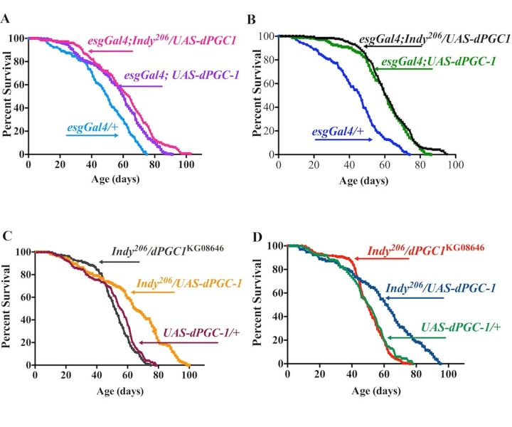 Decreased Indy expression and restricted upregulation of dPGC-1 in midgut stem and progenitor cells extends lifespan in flies [12, 13, 17]. As described above, Indy mutants have significantly increased dPGC-1 mRNA levels in the midgut throughout lifespan (Fig. 1C); therefore we investigated whether these two longevity pathways share a similar mechanism. We used the esgGAL4/UASdPGC-1(SpargelEY05931) system to overexpress dPGC-1 in stem and progenitor cells of the digestive tract [17, 28]. To avoid any effects of genetic background, all flies were backcrossed to yw background for 10 generations. Although esgGal4 is also expressed in stem cells of malpighian tubules, the testis and in salivary glands, we focus our attention on the effects of overexpressing dPGC-1 on midgut physiology due to its importance in healhy aging [25]. We censored the first 9 days following eclosion to reduce the influence of early, non-age associated death on longevity studies. Female and male esgGal4;UAS-dPGC1 flies have increased median lifespan by 19.9% and 35.1%, respectively, compared to control esgGal4/yw flies (Fig. 5A,B, Table 3). If Indy and dPGC-1 longevity pathways overlap, we would not expect that overexpression of dPGC-1 in esg-positive cells of Indy206 mutant flies (esgGal4;Indy206/UAS-dPGC-1) to further extend longevity of Indy mutant flies. Compared to controls, these flies have median lifespan extension of 27.7% and 40.6%, in females and males, respectively. As predicted, they do not experience additional increase in lifespan compared to esgGal;UAS-dPGC-1 (Fig. 5A,B, S5A, Table 3).
