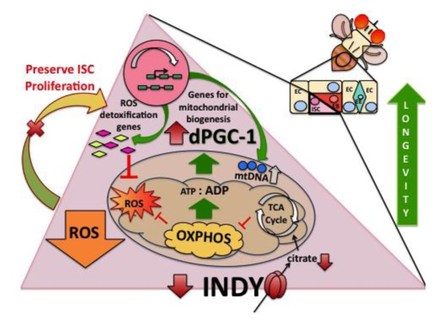 Here we describe a role for Indy as a physiological regulator that modulates expression in response to changes in nutrient availability. This is illustrated by altered Indy expression in flies following changes in caloric content and at later ages suggesting that INDY-mediated transport is adjusted in an effort to meet energetic demands. Further, we characterized role for dPGC-1 in mediating the downstream regulatory effects of INDY reduction, such as the observed changes in Indy mutant mitochondrial physiology, oxidative stress resistance and reduction of ROS levels. Longevity studies support a role for dPGC-1 as a downstream effector of Indy mutations as shown by overlapping longevity pathways and absence of lifespan extension without wild-type levels of dPGC-1. Our findings show that Indy mutations affect intermediary metabolism to preserve energy balance in response to altered nutrient availability, which by affecting the redox environment of the midgut promotes healthy aging.