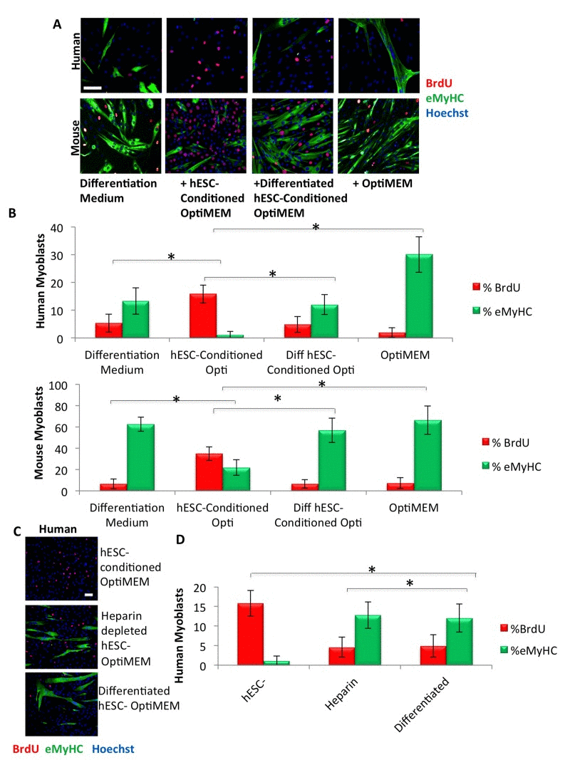 We recently published that in the mouse system, the pro-myogenic activity of hESC-conditioned Opti-MEM is contained in proteins with heparin-binding activity [17]. To explore the evolutionary conservation of this phenomenon in a human system, we cultured primary human muscle progenitor cells in a 50/50 mixture of the low-mitogen differentiation medium plus hESC-conditioned Opti-MEM that was either complete or depleted of heparin-binding proteins. As shown in Figure 1 (C, D), the proliferation of human myogenic cells is greatly enhanced and their differentiation is inhibited by the hESC-conditioned Opti-MEM, but this pro-myogenic effect is lost when heparin-bound proteins are depleted.
