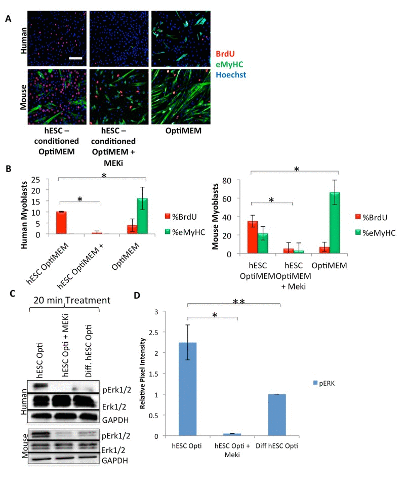 hESC-conditioned medium loses its rejuvenating effect on mouse stem and progenitor cells when the MAPK pathway is inhibited [14]. Considering the evolutionary conservation of the pro-myogenic activity of hESC-produced proteins between mouse and human, we examined the dependence of hESC-produced proteins on MAPK in human muscle progenitor cells. With only 2% horse serum, differentiation medium is low in mitogens and growth factors, and quickly (in 48-72 hours) promotes the differentiation of myoblasts into multinucleated myotubes. MAPK inhibition, via incubation of human muscle progenitor cells for 72 hours in a 50/50 mixture of differentiation medium and hESC-conditioned Opti-MEM along with a mitogen-activated protein kinase-kinase inhibitor (MEKi), drastically inhibited the proliferation of primary human muscle progenitor cells, assayed by a BrdU incorporation pulse (Figure 2A, quantified in B), suggesting that the hESC-produced, pro-regenerative proteins signal through the MAPK pathway in human muscle progenitor cells (Figure 2A, B). These results are conserved with mouse myoblasts and with old mouse muscle regenerative cells, as confirmed by incubation of mouse cells in hESC-conditioned Opti-MEM with or without treatment with MEKi (Figure 2A, B, Supplementary Figure 2B, and as previously published [14]).