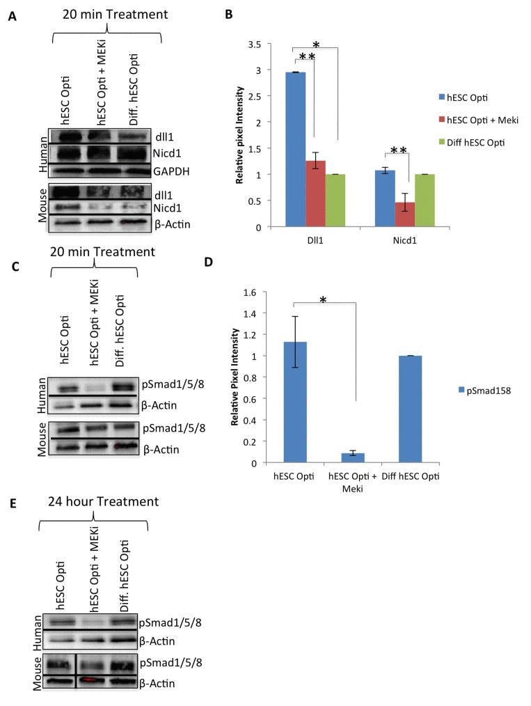 Considering the prominent evolutionary-conserved cross talk between MAPK and Notch pathways, we examined whether MAPK/pERK signaling is required for the activation of the Delta/Notch pathway by the hESC-produced factors [3, 6]. Western blotting was performed on human and mouse muscle progenitors that were serum starved for one hour and then exposed for 20 minutes to hESC-produced proteins in the absence or presence of MEKi. As shown in Figure 3A and B, Delta-1 was up-regulated by the hESC-conditioned medium in both human and mouse primary muscle progenitor cells, and NICD upregulated in mouse cells, but not when MAPK signaling was inhibited. Expression levels of Wnt/β-catenin and TGF-β/pSmad2,3 pathway components, on the other hand, were not regulated by hESC-produced proteins, or affected by MEKi, after a 20 minute or even 24 hour exposure (Supplementary Figure 3A, B). Finally, even though BMP/pSmad1,5,8 signaling was not activated by the hESC-conditioned medium in human or mouse primary muscle progenitors (Figure 3C, D), this pathway was dependent on intact MAPK signaling in myoblasts of both species: phosphorylation of pSmad1,5,8 was significantly down-regulated by the MEK inhibitor by 20 minutes of treatment in human and mouse cells (Figure 3C, D), and remained inhibited even after 24 hours of treatment in human myoblasts (Figure 3C, D and E).