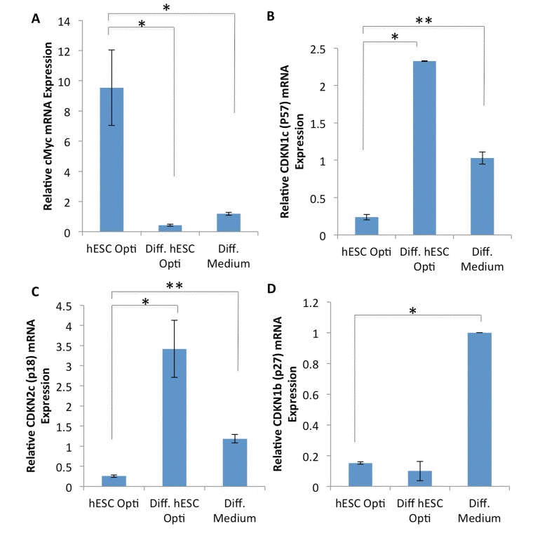 To further understand the mechanisms by which hESC-produced factors enhance the regenerative responses of muscle progenitor cells, gene expression analysis was performed on the downstream targets/effectors of the above signaling pathways, with a specific focus on the regulators of cell cycle progression. Human myoblasts were cultured for 72 hours in a 50/50 mixture of differentiation medium plus medium conditioned by either hESCs or differentiated hESCs, or in 100% of differentiation medium, followed by mRNA expression analysis by RT-PCR. As shown in Figure 4A-C, hESC-produced factors induced expression of c-Myc and down-regulated the levels of p57 and p18 cyclin dependent kinase (CDK) inhibitors. Interestingly, the level of another CDK inhibitor p27 was down-regulated by both pro-myogenic medium conditioned by hESCs and control medium conditioned by their differentiated progeny (Figure 4D). However, the expression of an additional regulator of cell cycle progression, cdc25a, was not influenced by either hESC or differentiated hESC-conditioned medium (data not shown). These results demonstrate that hESC-produced proteins do not down-regulate cell cycle inhibitors broadly, but rather influence a specific subset of the downstream effectors of cell proliferation in human muscle progenitor cells. Con-sidering that these downstream effectors are direct targets of the MAPK/pERK and Delta/Notch pathways, such signaling cascades could interact in a combinatorial fashion to induce c-Myc and repress p18 and p57 in muscle progenitors, promoting their regenerative capacity.