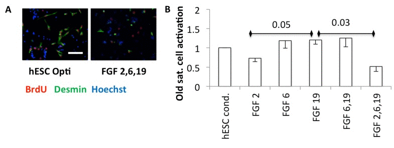 These results demonstrate that FGFs 2, 6, and 19 are not only enriched in serum-free medium conditioned by the hESCs, but are sufficient for pro-myogenic effects in mouse and human systems and additionally in their combination, to enhance the repair of old injured muscle.