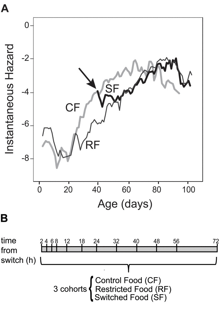 Canton-S flies were obtained from the Bloomington Drosophila Stockcenter at Indiana University (Bloomington, IN) and kept at 25°C in a temperature-controlled incubator at 50% humidity with a 12-hour on/off light cycle. The parental generation of flies was raised on food containing 30 g/L autolysed yeast, 120 g/L sucrose, 50 g/L cornmeal, 10 g/L agar with added dry live yeast. Experimental flies were collected in a 24-hour window, anesthetized under light CO2, sorted into vials at a density of 25 males and 25 females per vial, and randomly divided into treatment groups. The flies were then passed every day on either Control Food (CF, 150 g/L sucrose, 150 g/L autolysed yeast, and 20 g/L agar, all w/v) or Restricted Food (RF, 50 g/L sucrose, 50 g/L autolysed yeast, and 20 g/L agar, all w/v) and the number of dead flies recorded. On day 40, half of the flies on Control Food were switched to the Restricted Food. During the course of the experiment, age-specific instantaneous mortality rate was analyzed and the separation of mortality rate between the food conditions was verified before the switch. Flies were sorted under light CO2 and collected at fixed time intervals 2, 4, 6, 8, 12, 18, 24, 32, 40, 48, 56, and 72 hours after the switch time point via snap freezing in liquid nitrogen and were stored at −80°C. Heads and thorax of female flies were collected for microarray experiments.