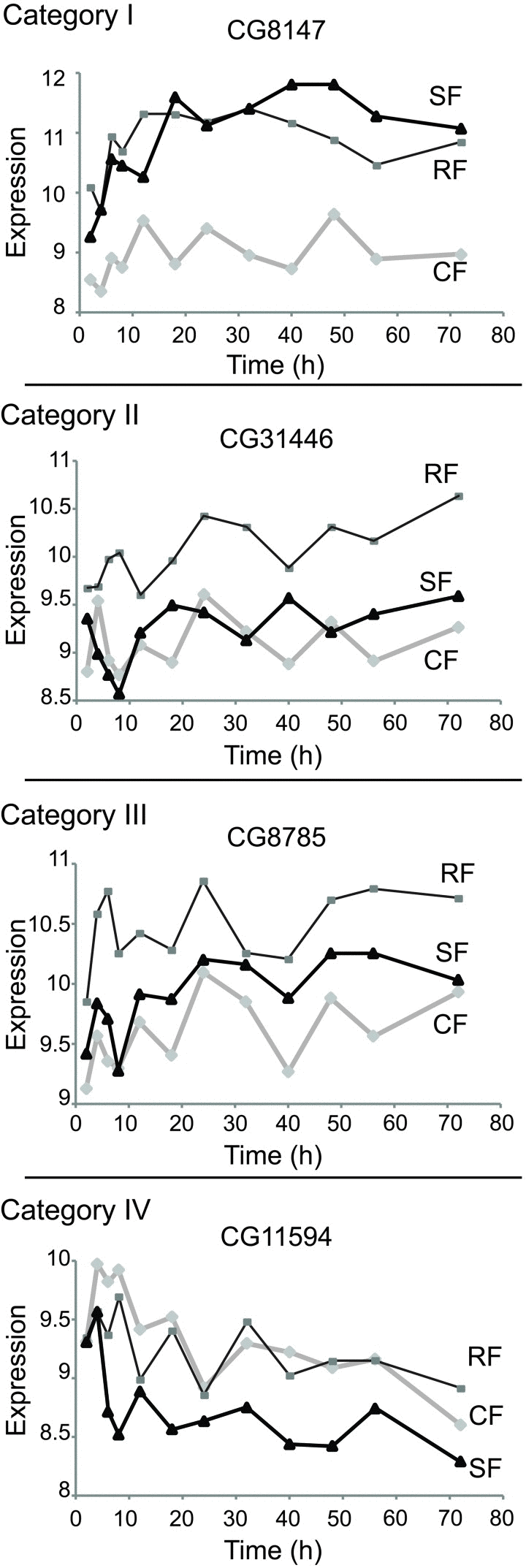 From the 853 genes that differentiate the CF and RF cohorts, genes likely to cause reduced mortality in DR flies will show temporal dynamics in the SF cohort. These candidate DR affecter genes are expected to depart from the expression level of the CF cohort and acquire the expression level observed in the RF cohort. In a statistical test these Category I switching genes show no significant difference between SF and RF but a significant difference between SF and CF (based on FDR threshold of 0.05, see Methods). 144 genes produced Category I switching dynamics, illustrated by the case of CG8147 in Figure 2. Category II and III contain genes whose expression level is determined by the nutritional history of the cohort. Category II genes (198 cases, Table 2) retained the expression level of the CF cohort after the time of the diet switch (at all time points: SF = CF and SF ≠ RF), exemplified by CG31446 in Figure 2. Category III genes (7 cases, Table 2) diverged from the CF cohort expression level after the switch but did not acquire the expression level of the RF cohort within the mortality switch timeframe; exemplified by CG8785 (Figure 2). Category IV genes were identified from those that did not differ between RF and CF (not in the set of 853); among these, 12 genes in the SF cohort diverged from the level measured in CF but did not adopt the level seen in RF, exemplified by the CG11594 gene (Figure 2). These deviating genes respond to the diet switch but not to chronic DR.