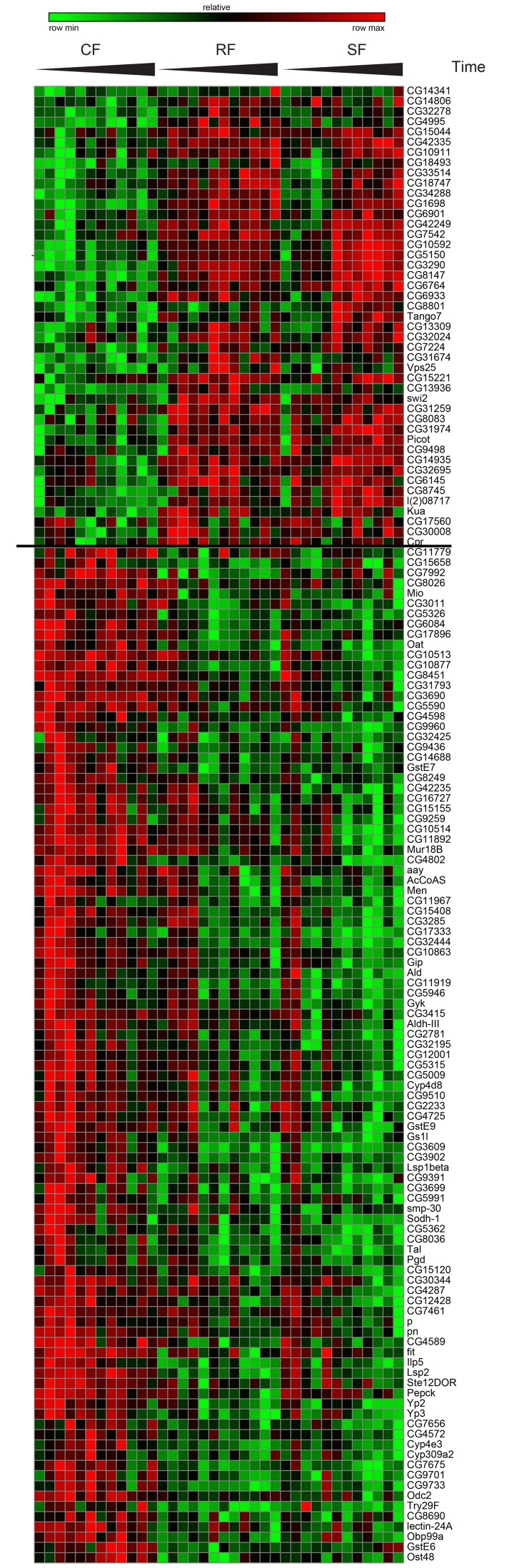 Transcriptional changes that contribute to reduced mortality during DR must occur within the time-frame when a switched cohort adjusts its mortality to the level of the continuous RF cohort, that is within the three days following the acute diet switch. Hence we profiled gene expression in the CF, RF and SF cohorts at high resolution within the first 72 hours following the diet switch. Beginning at age 40 days we sampled 25 females and 25 males from each of at least 3 vials from each cohort (recording these decrements as censored observations in the life table) at 2, 4, 6, 8, 12, 18, 24, 32, 40, 48, 56, 72 hours (Figure 1B). mRNA was extracted from head and thorax of female flies for transcriptional profiling based on Affymetrix Drosophila 2.0 microarrays.
