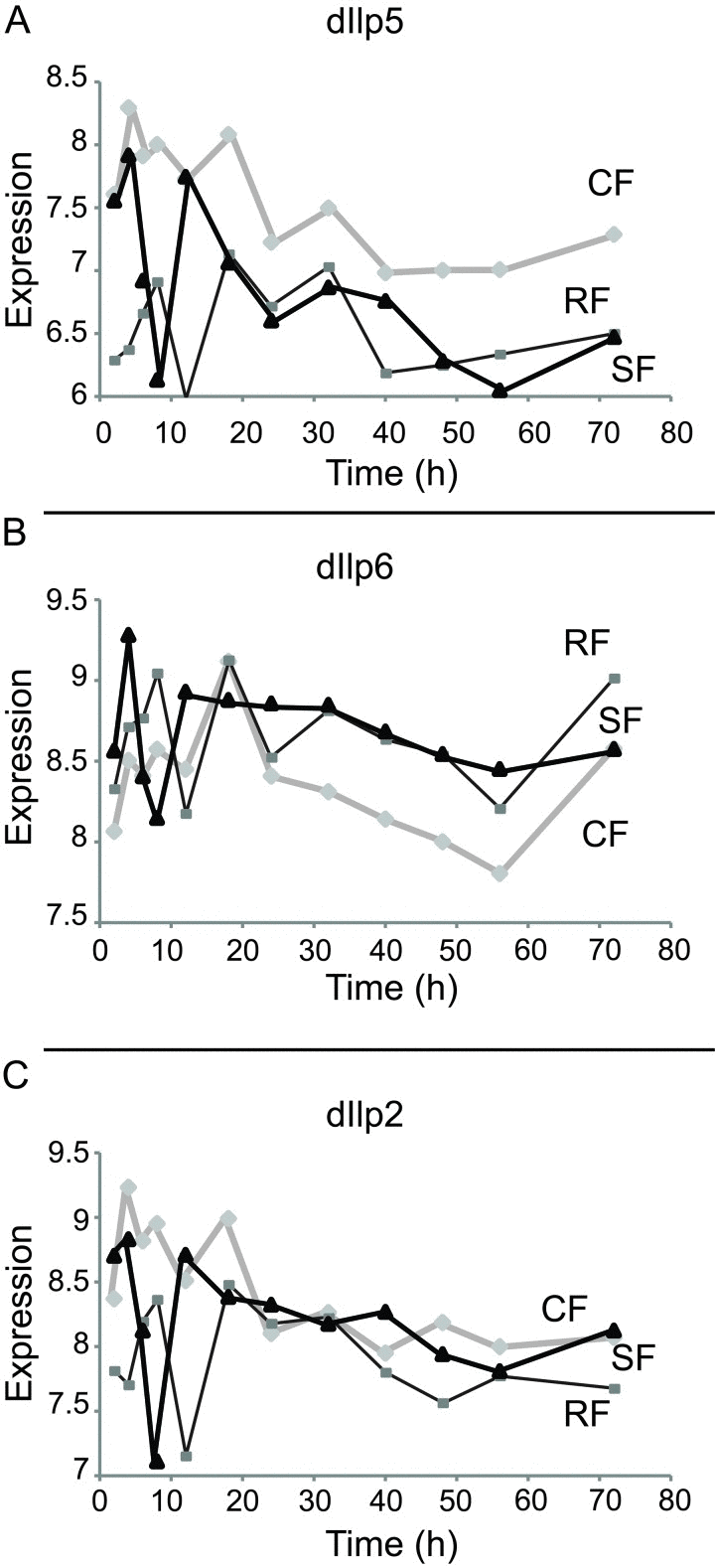 Reduced insulin/IGF signaling extends life span in many species including Drosophila [17]. The Drosophila genome encodes 8 insulin-like peptides (dilp1-8). Ablation of DILP producing cells within adults extends lifespan, as does mutation of dilp2. Although single mutations of dilp2 or dilp5 do not affect the ability of DR to extend lifespan, the combined mutation of dilp2, 3, and 5 extends lifespan and appears to block the impact of DR upon aging [18]. Probes for dilp2, dilp5 and dilp6 were present on the Drosophila 2.0 microarrays. The level of mRNA for dilp2 was constant and similar amongst all the cohorts (Category VI, Figure 4C). dilp5 presented as a switching gene (Category I, Figure 4A). Although dilp6 was elevated in chronic DR, the variance of its expression level was too large to gain statistical significance as a Category I gene even though expression level in the SF cohort appears to match that of the RF cohort at late time points (Figure 4B).