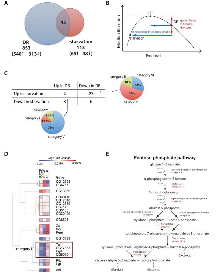 Fujikawa et al. examined the gene expression changes in flies starved for 24 hours and observed 65 genes whose expression increased under starvation, and 48 genes whose expression decreased [27]. In both our chronic DR and Fujikawa et al. experiments the number of up-regulated genes exceeded the number of down-regulated genes although in slightly greater proportion in chronic DR (172% in DR versus 135% in starvation). Of the 853 genes differentially expressed in our study in response to chronic DR, 45 were also detected as differentially expressed in response to starvation (Figure 5A). Only 22% (i.e. 10 genes) changed in the same direction in both experiments, and of these, 4 genes were up-regulated in both experiments (CG1662, CG18135, and klu in category VI and CG16986 in category 2), and 6 were down-regulated in both experiments (CG14688, CG32425, CG943, fit, and Lsp2 in category I and sug in category VII) (Figure 5C). Most genes differentially expressed in both experiments, 78% (i.e. 35 genes), changed in opposite directions. Of these, a minority (8 genes) were up-regulated in DR but down-regulated in starvation and belonged primarily to category VI. The remaining 27 genes were up-regulated in DR and down-regulated in response to starvation, and more than half of them (14 or 52%) were categorized as switching genes. Pathway analysis performed on this group of 14 switching genes showed that the pentose phosphate pathway and pyruvate metabolism were significantly enriched (q value < 0.05). In particular a closer inspection of the pentose phosphate pathway revealed that a group of four key enzymes regulating several steps along most of the pathway – lactonase, 6-phosphogluconate dehydrogenase, transketolase, and transaldolase – were significantly down-regulated in response to both adult onset and chronic dietary restriction, but significantly up-regulated in response to starvation (Figure 5D-E). Fasting will increase the flux of glucose 6-phosphate to ribose 5-phosphate, and the production of NADPH+H and reduce glutathione, while DR will retard this flow.