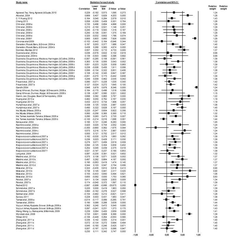 The results indicated a significant and positive association between age and DNA damage in 76 correlations of the 36 studies (N = 4676) r = 0.230, p = 0.000 (95% confidence interval = 0.111; 0.342). A test for heterogeneity of variance indicates that the results of the study are significantly higher than would be expected, Q (75) = 1754.831, p = 0.000. The effect size of each study can be seen in Figure 1.