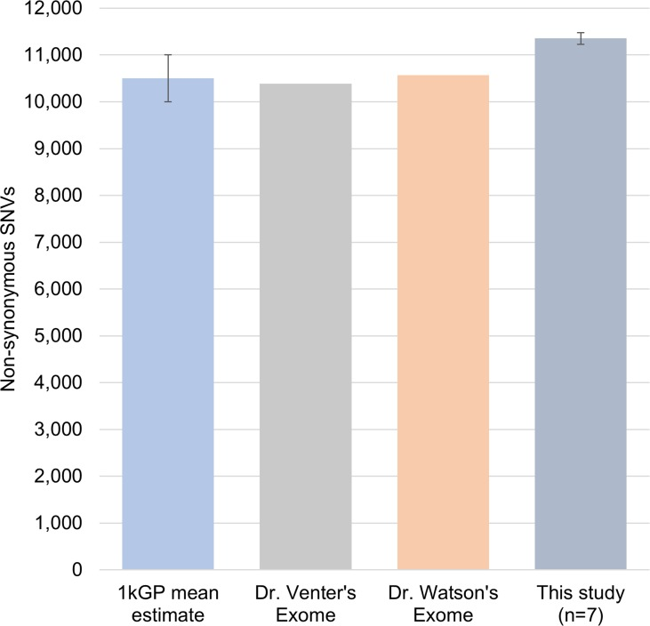 These individuals had between 11,100 to 11,500 nsSNVs (nonsynonymous single nucleotide variants) at any age time-point studied when compared to the human genome reference (Table S1). The 1000 Genome Project (1kGP) estimated that an individual typically differs from the reference human genome sequence at 10,000-11,000 non-synonymous sites [17]. In other independent studies, Dr. Venter and Dr. Watson's exome were reported to show 10,389 and 10,569 nsSNVs, respectively [18, 19]. These data indicate that the individual's genomic changes in our study are in close agreement with the range of previously reported nsSNVs across individuals (Figure 1), and that this is not a small effect. Using the human genome reference (hg19), we found an overall increase of 725 and 156 SNVs and indels at different ages for two individuals (1 and 2), respectively, and a decrease of 301 and 255 variants in individual-3 upon nine and fifteen years of aging (Table S1), respectively. List of all the variations called is presented in Table S2.