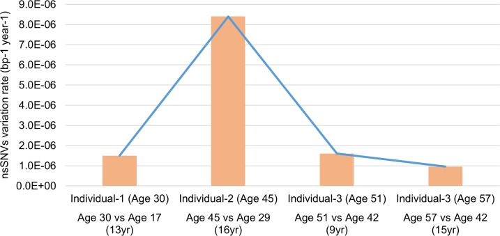 Exomes of these individuals exhibited a variation rate of 9.6×10−7 to 8.4×10−6 bp−1 year−1 for nsSNVs (considering the 62.2Mb of target sequence), which have aged experiencing different stress and environmental exposures and because the genomic region was exclusively exomes may represent a selection pressure that is different from the whole genome (Figure 2). Compared to the reference human genome, individual-2 does not appear very different from other individuals in terms of the total number of genomic variations with respect to the reference (Table S1). However, he exhibits a very high nsSNVs variation rate (8.4×10−6 bp−1 year−1) when referenced to his own previous genomic state. This finding is of particular significance because it highlights the importance of genomic status relative to personal genomics, rather than observations made from a standard reference genome that are missing valuable details especially, individual specific genomic variation trends and behavior.