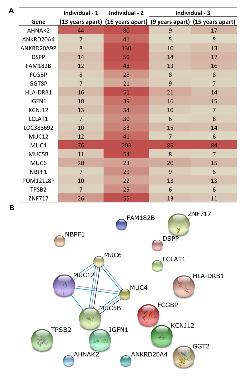 Three unrelated and ‘healthy’, individuals demonstrate acquired genetic variants as a consequence of aging and the accumulation of variants occurs at different rates. Mutations were observed in up to 13,000 genes in these individuals including some common genes with consistently high numbers of mutations. To identify the most frequently mutated genes upon aging, we compared the lists of the mutated genes from each individual. This resulted in the identification of 20 genes that are consistently and highly mutated upon aging (Figure 3A). We identified MUC4 as the most frequently mutated gene in all three individuals acquiring >75 mutations. In-fact, four MUC genes (MUC4, MUC5B, MUC6, and MUC12) were among the top mutated genes in all three individuals (Figure 3A). These top 20 genes did not have known protein-protein interactions except for the MUC family genes (Figure 3B). This indicates a previously unknown association among these genes and aging. Previous studies have associated differential MUC4 expression with a number of cancers, including pancreatic, lung, breast, gall bladder, salivary gland, prostate and ovarian cancer, indicating that MUC4 may be a good candidate as a diagnostic and prognostic marker [25]. In one breast cancer study, silencing MUC4 led to reduced expression of HER2, although the molecular mechanism of this interaction is unknown [26]. Over-expression of HER2 occurs in 30% of breast cancers and has been used effectively as an adjuvant therapy drug target in these patients [27]. It is interesting to note here that MUC genes were not previously reported as the most frequently mutated genes in any disease or condition. In addition, the functional significance of the MUC, especially the MUC4 mutations upon aging is unclear at this time and warrants further investigation.