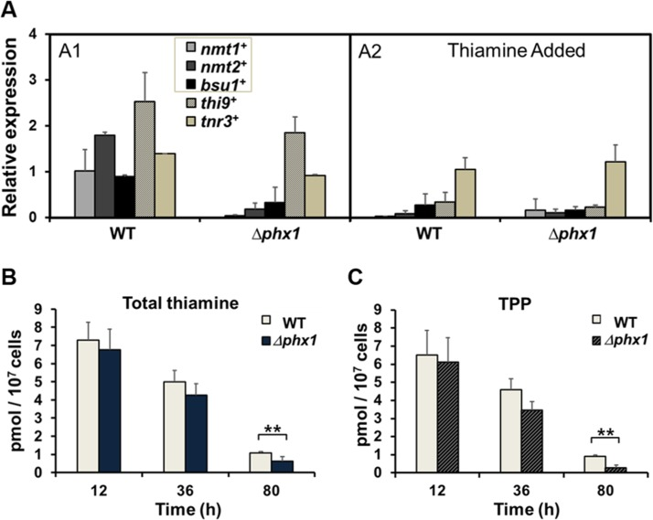 Results from qRT-PCR of RNAs from wild-type and Δphx1 mutant cells demonstrated that thenmt1+, nmt2+, and bsu1+ transcripts decreased in the Δphx1 mutant in the absence of thiamine, whereas the thi9+ gene was not, as observed in microarray analysis (Fig. 1, panel A1). Added thiamine repressed expression of all genes, except tnr3+ in the wild type (Fig. 1, panel A2). The thi9+ gene was also repressed by thiamine in the Δphx1 mutant (Fig. 1, panel A2). Therefore, the decrease in the expression of three Phx1-dependent genes (nmt1+, nmt2+, bsu1+) is not due to feedback regulation by increased thiamine in the Δphx1 mutant, but suggests that Phx1 positively regulates the three genes for thiamine supply.