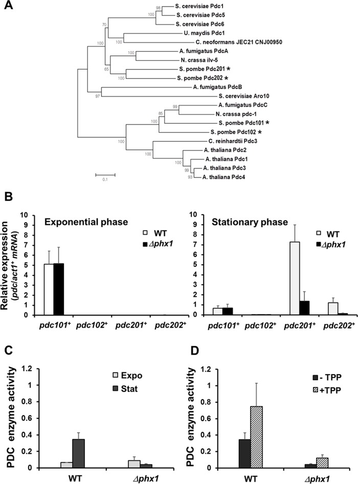 The microarray analysis revealed that transcripts from two genes (SPAC13A11.06 and SPAC3G9.11c) encoding putative pyruvate decarboxylases (PDCs) were significantly lowered in Δphx1 mutant (Table 1, Table S1). The PDC enzyme utilizes thiamine pyrophosphate (TPP) as a cofactor, and constitutes a distinct subgroup of the TPP-dependent enzyme family [23]. There are four PDC-like proteins predicted from the genome of S. pombe. Since the gene name pdc1 has been already used for mRNA decapping scaffold protein (SPAC4F10.01) [24], we propose to name the paralogs as pdc101(SPAC1F8.07c), pdc102(SPAC186.09), pdc201(SPAC3G9.11c), and pdc202(SPAC13A11.06). Phylogenetic relatedness of PDC-like proteins in S. pombe as well as in other representative fungi is presented in Fig. 2A.