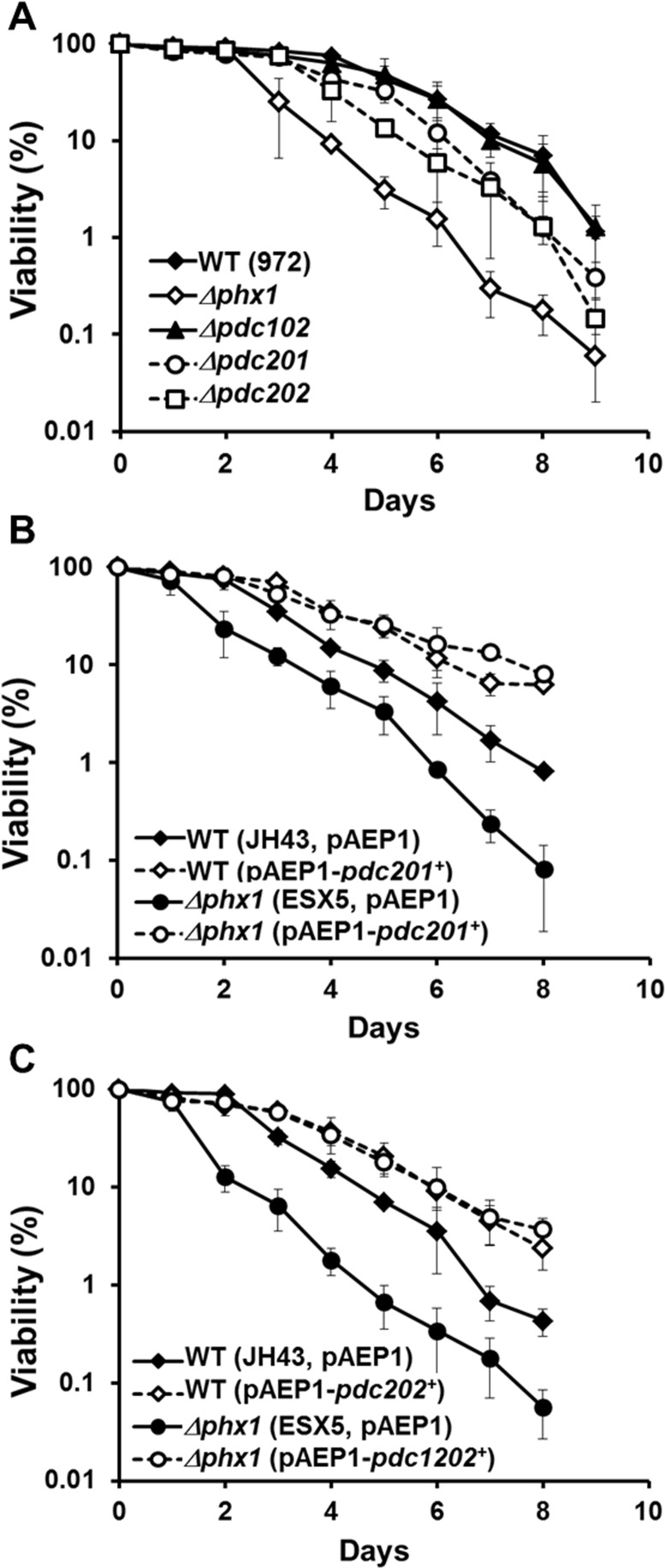 Whether PDC contributes to long-term survival of S. pombe was assessed by gene disruption and overexpression. We created Δpdc201, Δpdc202, and Δpdc102 mutants and compared their long-term viability in EMM with the wild type (972) and the Δphx1 mutant (JY01). We were not able to obtain a Δpdc101 mutant, consistent with the prediction that this gene is essential [27]. The results in Fig. 3A demonstrated that the Δpdc201 and Δpdc202 mutations reduced cell viability in the stationary phase, even though not as pronounced as the effect of Δphx1 mutation. The Δpdc102 mutation did not affect cell viability significantly. The double mutation of Δpdc201Δpdc202 did not cause further reduction in viability (supplementary Fig. S1). We then examined the effect of overproduction by cloning the pdc201+ or pdc202+ gene behind the adh1+ promoter on pAEP1, a pREP1-based vector [16], and introduced them to the wild type (JH43) or Δphx1 (ESX5). Results in Fig. 3B and 3C demonstrated that overproduction of either Pdc201 or Pdc202 increased the long-term viability of both the wild type and Δphx1 mutant. These observations support the proposal that the mechanism behind the positive action of Phx1 in extending stationary cell survival relies heavily on the increase in pyruvate decarboxylases.