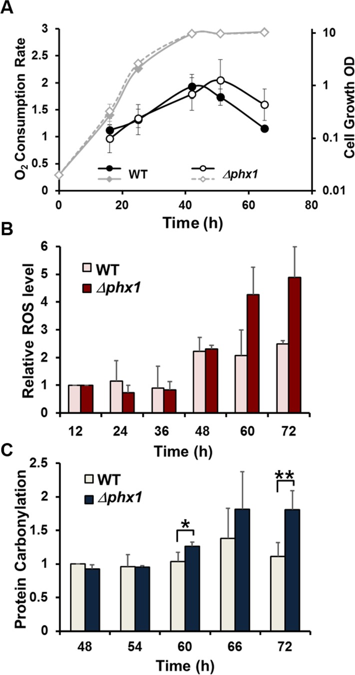 Based on the increased synthesis and activity of Pdc201 and Pdc202 enzymes during stationary phase, we hypothesized that mitochondrial respiration may decrease as S. pombe cells enter into stationary phase. We therefore estimated oxygen consumption rate in the wild type and the Δphx1 mutant grown in minimal media. Fig. 4A demonstrated that the oxygen consumption in the wild type cells peaks at around 40 h after inoculation, when cells enter the stationary phase, and decreases steadily thereafter. On the other hand, the Δphx1 mutant maintained the high rate of respiration longer, for about 20 hours after cells entered stationary phase. When we measured glucose consumption during the growth of wild type and Δphx1 mutant cells, we found that glucose was exhausted at around 40 h, and there was no difference between wild type and Δphx1 mutant in consuming glucose (data not shown). This implies that the Δphx1mutation does not affect sugar metabolism, and possibly energy metabolism, during the exponential growth.