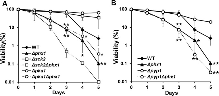 Extended lifespan of Δpka1, Δsck2, or Δpyp1 mutants was compromised by Δphx1 mutation