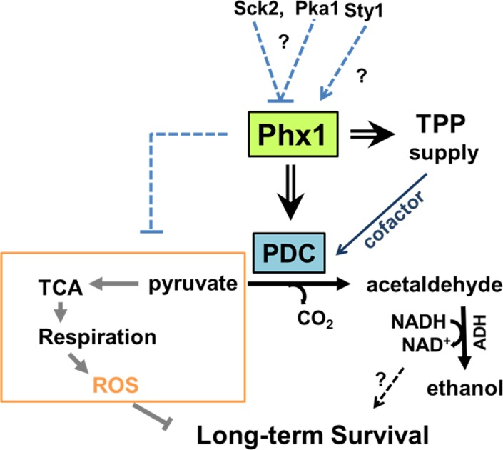 Previously, we identified a stationary phase-specific regulator, Phx1, with a homeobox domain that positively affects long-term survival and meiosis upon nutrient starvation [15, 16]. The phx1+ gene is expressed from late exponential to stationary phases, as well as in response to nutrient downshift. The Δphx1 null mutant showed decreased viability in long-term stationary culture, and was more sensitive to various oxidants and heat shock. The Δphx1/Δphx1 diploid cells were defective in forming meiotic spores. The target genes of Phx1 were expected to shed light on how Phx1 achieves these functions. In this study, we analyzedPhx1-dependent genes, and found a mechanism by which Phx1 contributes to chronological lifespan. It involves elevation of pyruvate decarboxylases to shift the carbohydrate/energy metabolism from respiration to fermentation as cells enter the stationary phase. This process presents a novel strategy to maintain viability by curtailing extended production of ROS in the stationary phase.