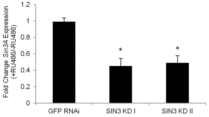 To test the efficiency of conditional knock down of Sin3A using the Gene-Switch system, total RNA was extracted from 25 day-old flies and RNA levels for Sin3A were measured using quantitative PCR following reverse transcription. RNA levels in the knockdown flies were reduced to less than 49% of control flies using either targeting construct (Fig. 1).
