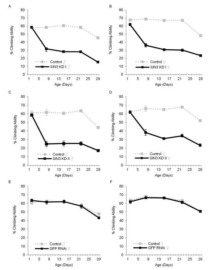 In this study we have addressed the role of the essential gene Sin3A in adult Drosophila. The data indicate that SIN3 is critical for locomotor function, resistance to oxidative stress and longevity. Previous studies have demonstrated a role for SIN3 during development [15-17]. Results presented here show that, in addition to participating in development and cell proliferation, SIN3 performs critical functions in differentiated tissue. The observed adult phenotypes indicate that SIN3 is important throughout the lifespan of Drosophila. The findings support a model in which the SIN3 corepressor is a key player in the stress response required to counter-act cellular assaults encountered during adulthood.