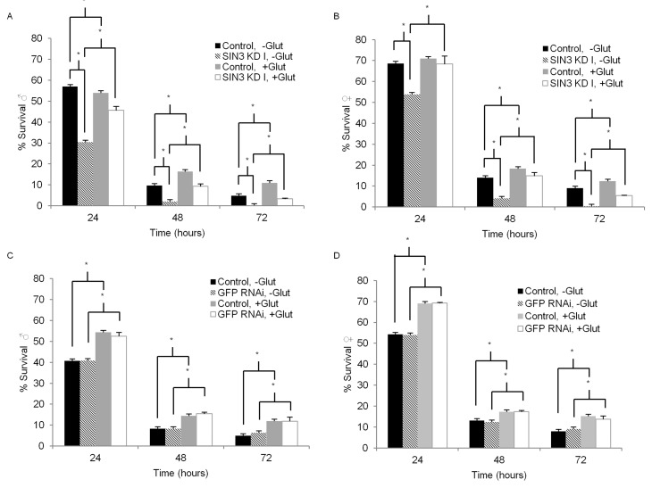 One way in which cells respond to an increase in the production of ROS is through the oxidation of glutathione (c-glutamyl-cysteinyl-glycine, GSH), as it donates an electron to these unstable species, resulting in the disulfide GSSG [43, 44]. Dietary glutathione supplementation has been shown to counteract the toxicity of paraquat, resulting in the increased survival of flies in paraquat sensitivity assays [45]. We therefore asked if glutathione supplementation could affect the tolerance of Sin3A knockdown flies to paraquat treatment. For these experiments, after eclosion, flies were placed on standard molasses food supplemented with 0.22 mM glutathione for one week. Next, similar to experiments described above, survival of male or female flies incubated with paraquat but in this case, supplemented with glutathione, was measured each day for three days. Consistent with previous reports [45], glutathione supplementation increased survival of nearly all flies treated with paraquat (Fig. 3A-D and Table 1). Interestingly, the effect was much more pronounced in flies in which SIN3 levels were reduced. In males with ubiquitous knockdown of Sin3A, glutathione supplementation ameliorated the strong paraquat sensitivity seen in the un-supplemented flies (Fig. 3A, compare light grey and white bars and Table 1). Similarly, in females with ubiquitous knockdown of Sin3A, glutathione supplementation increased the tolerance to paraquat over and above levels observed in the wild type counterparts (Fig. 3B, D, Table 1). For both sexes, the difference in paraquat sensitivity upon glutathione supplementation increased with increasing time of exposure (Table 1). In comparison, flies with wild type levels of SIN3 showed some resistance to paraquat toxicity with glutathione supplementation, but their survival rates did not increase dramatically and were relatively unchanged over the course of the experiment. GFP RNAi control flies also showed some level of increased resistance to paraquat toxicity upon glutathione supplementation, consistent with previously published reports [45]. Again, the increase in paraquat tolerance was much less than that observed in the Sin3A knockdown flies (Table 1). Glutathione supplementation had no effect on survival for the control conditions of 5% sucrose and no paraquat treatment (Supplemental Fig. 2). Results from this set of experiments indicate that SIN3 is important for responding to oxidative stress, possibly through regulation of cellular glutathione.