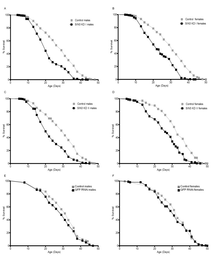 While these results demonstrating that a reduction of SIN3 leads to reduced longevity are consistent with the locomotor and paraquat sensitivity assays, they are somewhat surprising in light of previously published work indicating that inhibition of HDAC complexes with chemical inhibitors or haplo-insufficiency of Rpd3 leads to increased longevity [49-53]. Possibilities for these differing results will be addressed below. Data obtained from this study indicate that DrosophilaSin3A is important for normal lifespan and that reduced expression of this essential gene leads to shorter life.