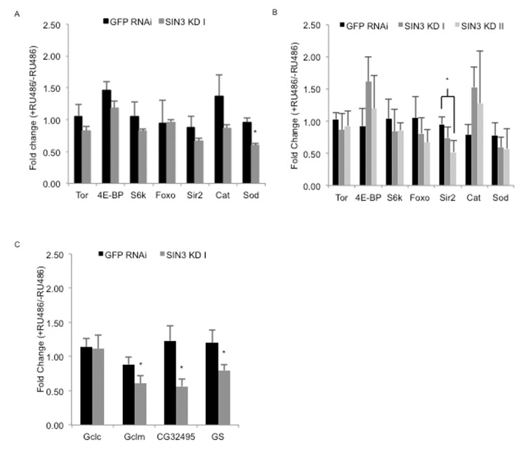 Total RNA was extracted from females using Trizol (Invitrogen) and purified using the RNeasy mini kit (Qiagen). cDNA was generated from total RNA using the ImProm-II Reverse Transcription System (Promega) with random hexamers. The cDNA was used as template in a quantitative real-time PCR (qPCR) assay. The analysis was performed using ABsolute Blue SYBR Green ROX master mix (Fisher Scientific) and carried out in a Stratagene Mx3005P real-time thermocycler. Taf1 and Pgk primers were used to normalize the RNA levels. To examine gene expression changes that result from ubiquitous reduction of SIN3 levels, candidate genes involved in Tor signaling and/or longevity (tor, 4E-BP, S6k, Sod, Cat, Foxo, Sir2) or in the paraquat-induced stress response (Gclc, Gclm, CG32495 and GS) were chosen. The mRNA levels (of seven or 20 day-old flies for Tor signaling and/or longevity genes or seven day-old flies for the glutathione synthesis genes) were quantified using real time PCR with specific primers for each gene (Supplemental Table 1). The gene expression changes are represented as the mean (± SEM) of the fold changes observed in the fly lines (GFP RNAi, SIN3 KD I and SIN3 KD II) with and without RU486. The fold differences were calculated by relative comparison of each fly line with RU486 to its respective counterpart without RU486, [GFP RNAi (+RU486)/GFP (-RU486), SIN3 KD I (+RU486)/SIN3 KD I (-RU486) and SIN3 KD II (+RU486)/SIN3 KD II (-RU486)]. This experiment utilized a minimum of three sets of RNA for each fly line.