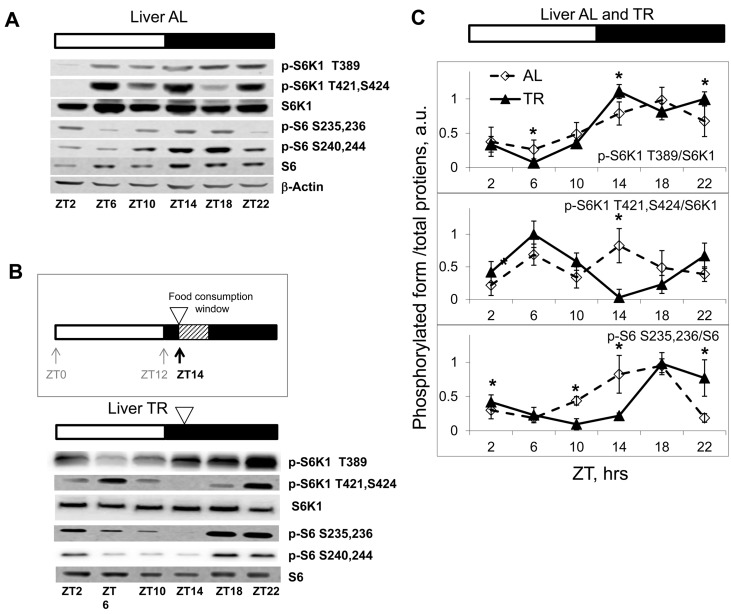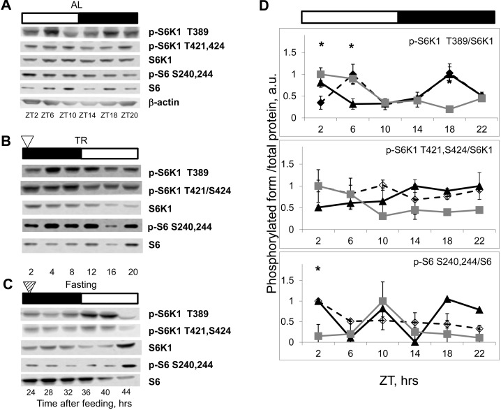 We monitored mTORC1 activity by assaying phospho-rylation of its downstream targets: the ribosomal protein S6 kinase 1 (S6K1) and ribosomal protein S6 in the tissues of wild type mice. We found that the levels of phosphorylation of the mTORC1 downstream targets significantly changed during the day in the liver (Figure 1A). Levels of phosphorylation reached a peak during the dark phase of the daily cycle when mice were active (feeding), and dropped low during the middle of the light part of the daily cycle, when mice slept/rested (fasting), supporting the previously published observations on the regulation of mTORC1 by feeding. However, tissues collected at the same time of the day from different mice showed significant variability in the phosphorylation status of S6K1 and S6 (compare phosphorylation signals on Figure 1A (one set of male mice), Supplementary Figure 1 (two sets of male mice) and Supplementary Figure 2 (one set of female mice). Because tissues were collected from the ad libitum (AL) fed animals, one possible explanation of this inter-individual variability in phosphorylation was the difference in feeding habits of individual animals. To test this possibility and to reduce the potential influence of uncontrolled feeding time, we applied the time-restricted (TR) feeding schedule.