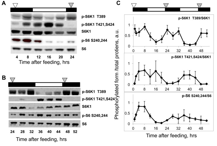 Importantly, we have noticed that after the level of phosphorylation of S6K1 at the T389 site reached its minimum at ZT6 (16 hrs after feeding), it then started to increase (Figure 1B and 1C). The signal at ZT10 (20 hours after the feeding) was higher than at ZT6 (16 hours after feeding) and was further increased at ZT14 (24 hrs after feeding, just before the next food administration), reaching a level comparable with the level at 4-8 hrs after feeding. Whereas the high level of phosphorylation at 4 and 8 hrs after feeding may present a direct response to feeding and increased level of nutrients and nutrient-induced insulin secretion, the increase in phosphorylation at 20 and 24 hrs after feeding (4 and 0 hrs before feeding) strongly suggests an internal regulation of these phosphorylation rhythms.