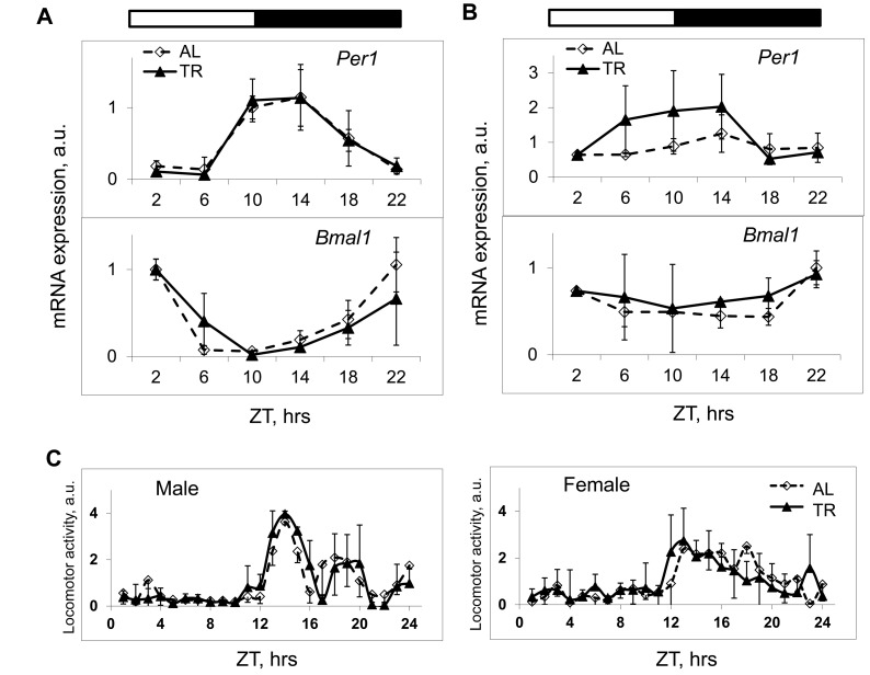 Bmal1−/− mice were obtained from Dr. C. Bradfield (University of Wisconsin). Cry1,2−/− were obtained from Dr. A. Sancar (University of North Carolina at Chapel Hills). Animals were maintained on a 12:12 light:dark cycle with lights on at 7:00 am, and fed on an 18% protein rodent diet (Harlan). Ad libitum (AL) group had unrestricted access to food. Time restricted feeding (TR) group received about 100% of their daily intake at ZT14, mice have been entrained for TR for 2 weeks. Fasting group has been entrained to TR and did not receive the food during the experiment. All groups have unrestricted access to water. All tissue collection experiments have been performed for 3-4 months old wild type and circadian mutant mice. Daily in cage behavior was monitored using infrared photobeam in cage activity system (San Diego Instruments). Animal activity was recorded every 60 minutes during 4 days, and analyzed using Cage rack Software. Activity of the same mouse was recorded for AL feeding and after 14 days of TR. All animal studies were conducted in accordance with the regulations of the Committee on Animal Care and Use at Cleveland State University.