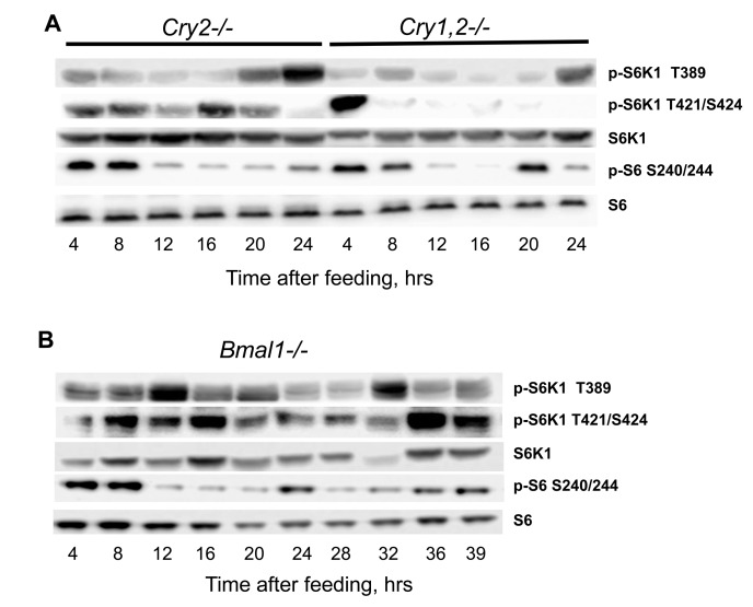 In order to directly test if NAMO is different from the known circadian clock, we assayed rhythms in mTORC1 activity in the tissues of mice deficient for the core components of the circadian clock: Cry1, Cry2 and Bmal1. Circadian clock deficient mice have been entrained by TR feeding, and tissues were collected around the 24-hrs cycle. Cry1 deficiency shortens the period of rhythms, Cry2 deficiency leads to period elongation, and double deficiency of these genes results in complete disruption of circadian rhythms in gene expression and behavior [8]. Neither deficiency for Cry2 nor double deficiency for both Cry1 and Cry2 affected rhythms in phosphorylation of S6K1 on the mTORC1-dependent T389 site: the minimum was observed around 12-16 hrs after feeding and the maximum - at 24 hrs or just before the feeding similarly to wild type (Figure 5A). Interestingly, the rhythms in phosphorylation on the mTORC1-independent sites 421,424 were not affected by deficiency of Cry2: similarly to wild type there were two peaks during the 24h period, the first peak at 4 hrs after feeding and the second at the middle of the light phase (16 hrs after feeding); however, although the first, food-dependent peak was preserved in the liver of Cry1,2−/− mice, the second peak was absent (Figure 5A), suggesting that this peak may be controlled by the light-entrainable circadian clock. We also assayed rhythms in the liver of Bmal1−/− deficient mice (Figure 5B). Importantly, we did not observe the peak in T389 phosphorylation at 24-28 hrs, but we detected a peak at 32-hrs after feeding.